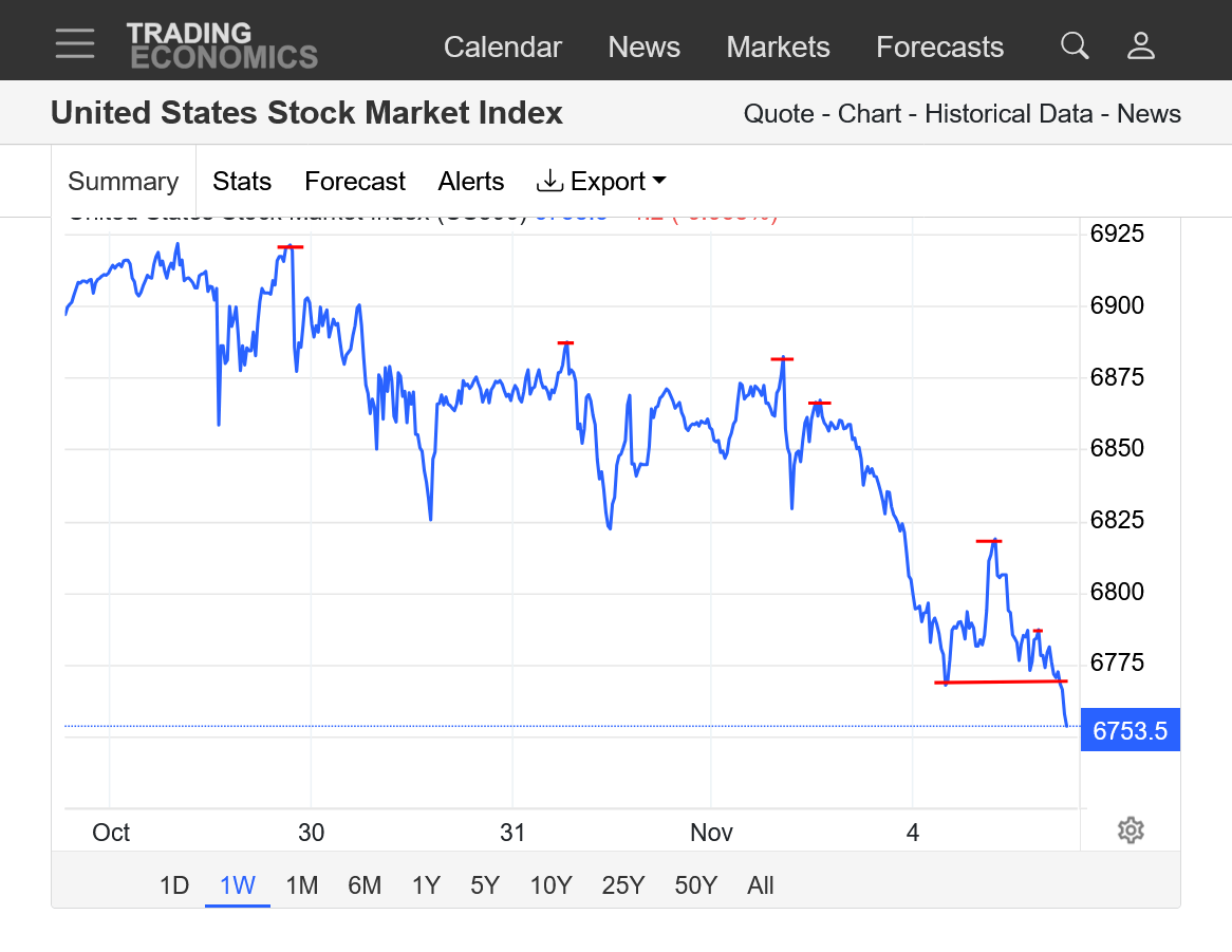 Put another way, a solid close below the previous record high, around 6750 on this index could be the start of a major drop lower.