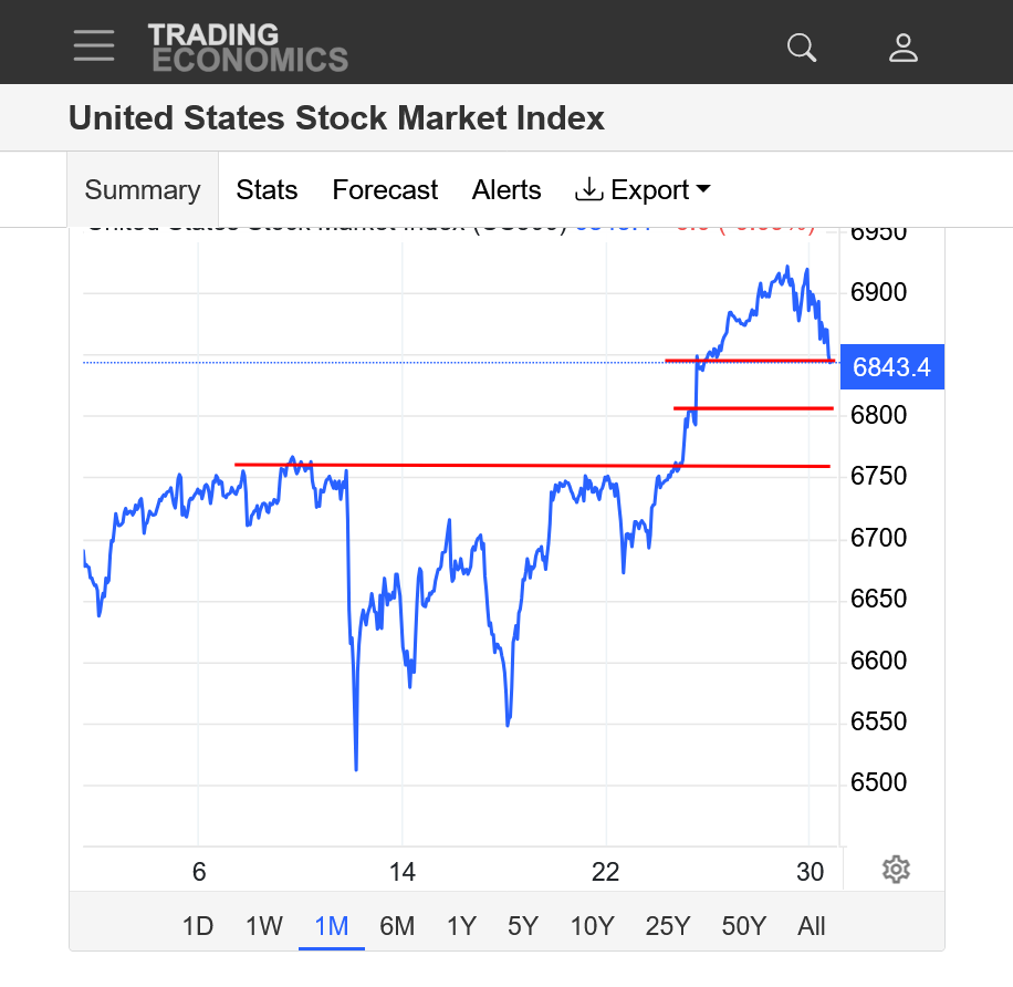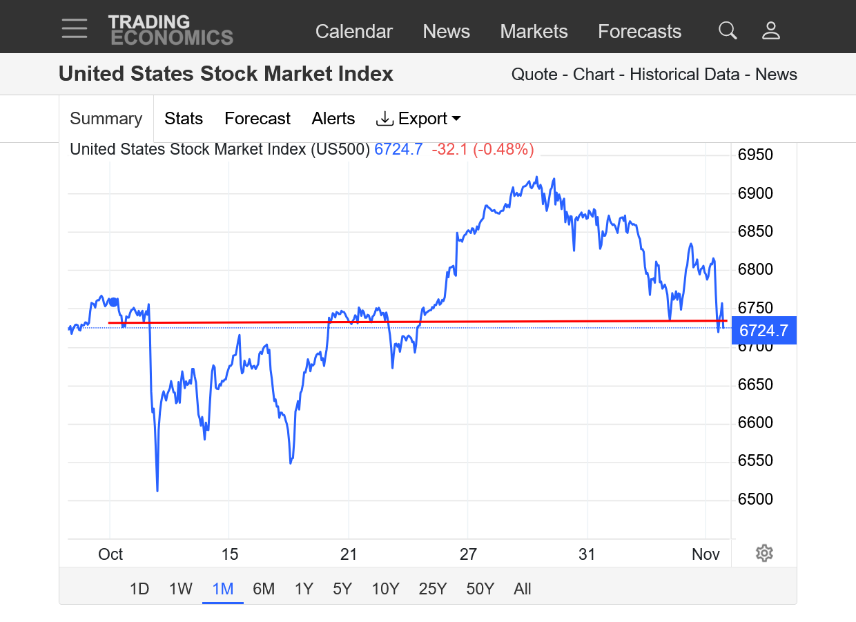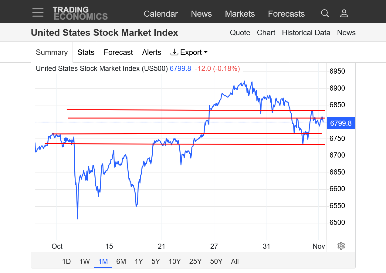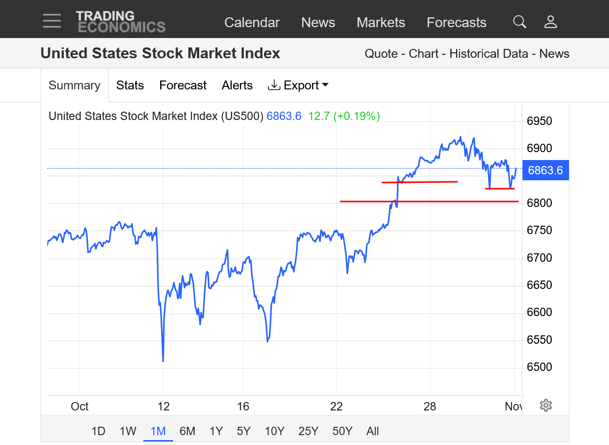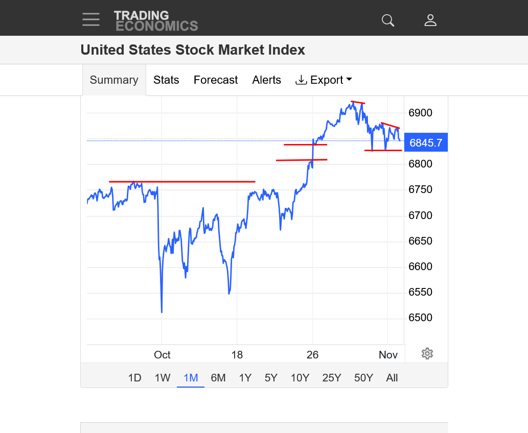 News could break us in either direction. News of the government shut down ending would take us to the upside since the extended shut down, negative tariff and economic news has somehow been unable to keep us down.......so far.