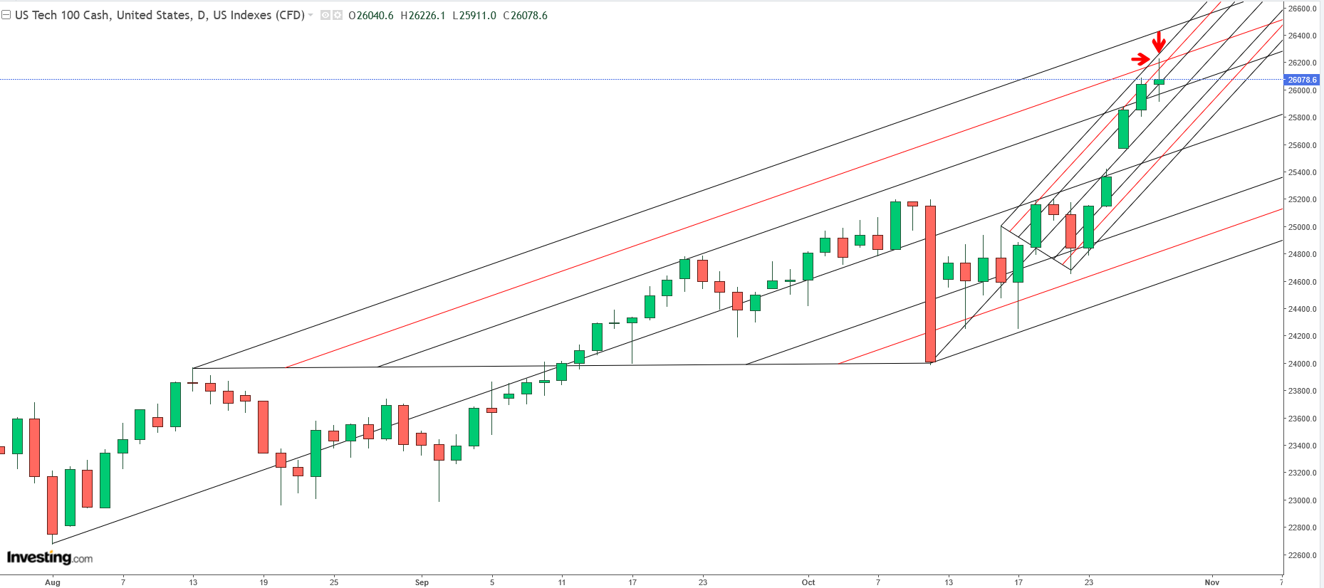 Surging to new highs again today with more irrational exuberance. The Fed will cut interest rates as expected. Will this be a buy the rumor-sell the fact trigger for the start of a correction?