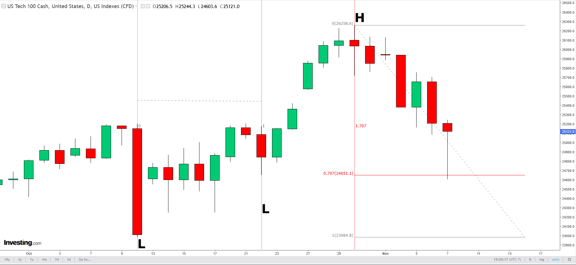 Put another way, a solid close below the previous record high, around 6750 on this index could be the start of a major drop lower.