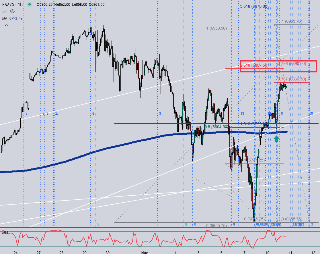 The NQ is currently pausing after hitting the 4.236 extension from the early Friday thrust, we may see a bit of a correction since we are definitely in overbought territory, notice however how we blew through the initial 0.707 and 0.786 retracement levels = bullishness