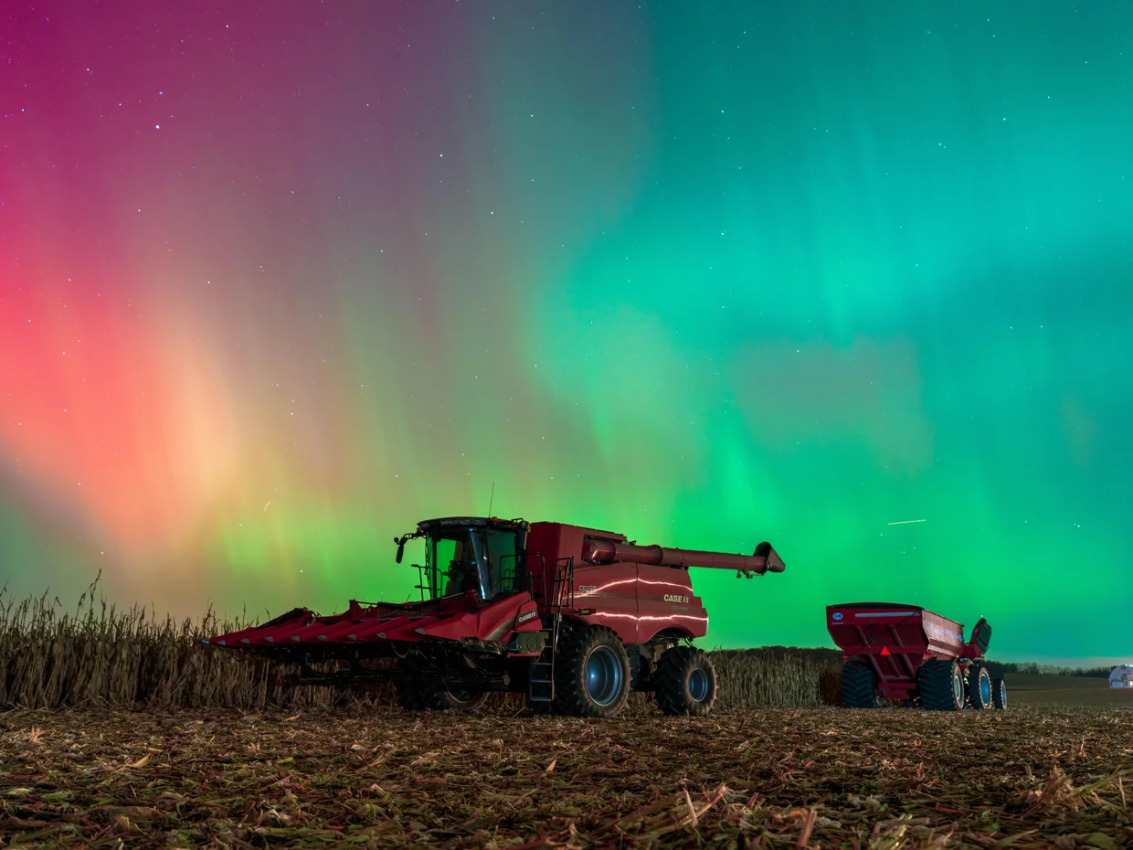 The aurora borealis lights up the night sky over Monroe, Wisconsin, on Nov. 11, 2025, during one of the strongest solar storms in decades. The geomagnetic event pushes the northern lights deep into the continental United States, with vibrant pink, red, and green hues illuminating rural farmsteads and open fields across the Midwest.