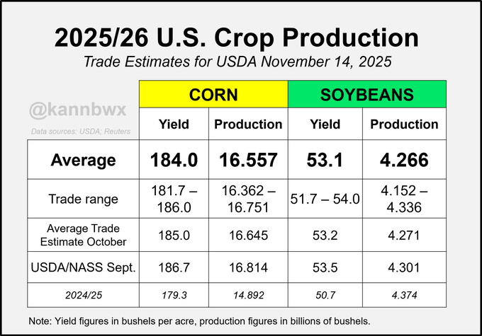 The trade is certain that U.S. corn yield will decline from the September levels on Friday, but that's not the case with soybeans (some see yield rising). Analysts peg the U.S. corn crop up 13.5% on the 5yr production average, but the soy crop is seen 0.7% below.