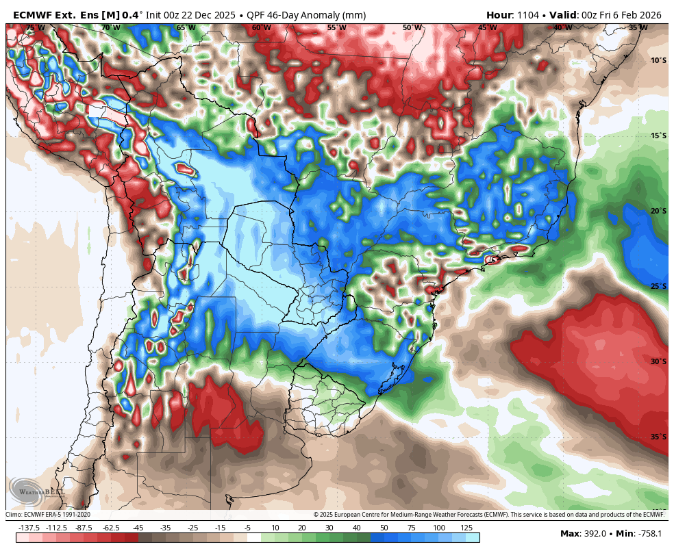 These below were total rain departures from the EE model going out thru mid January. Still dry in Argentina but not AS dry as forecasts in previous weeks and Brazil is in line for huge rains.