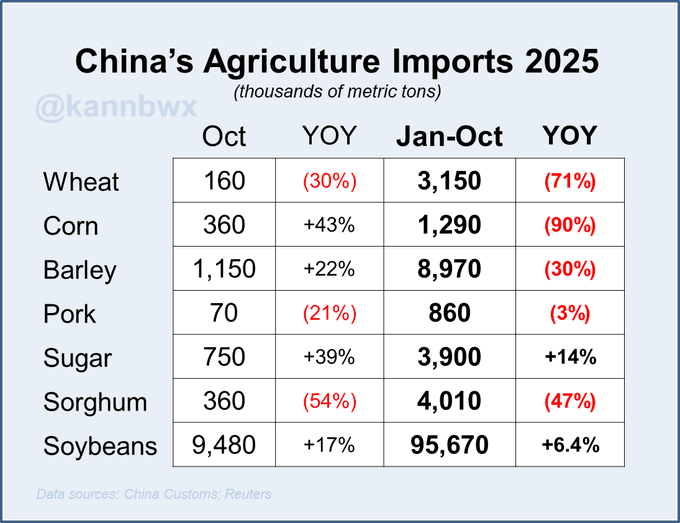 China imported more corn in Oct 2025 than Oct 2024, but YTD imports are down 90% on the year. Soybean imports are up 6.4% anchored by massive Brazilian arrivals, but most other imports - particularly grains - are down sharply from last year.