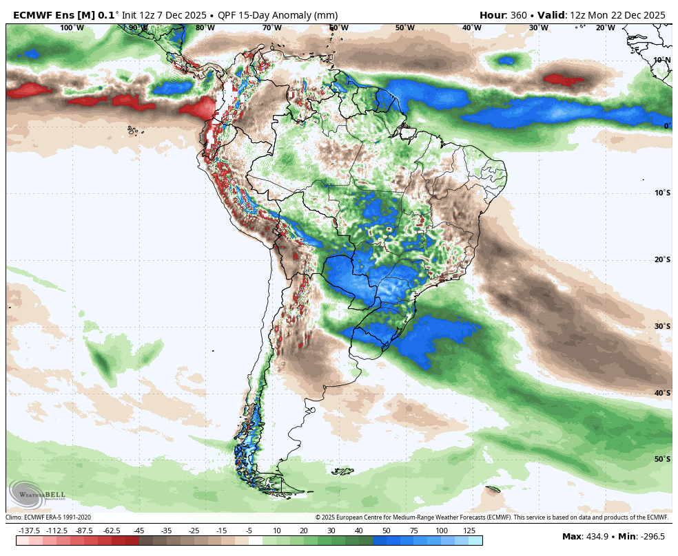 From the European Ensemble model, 2 week rains for South America. Pretty good for most areas except for a few dry spots.