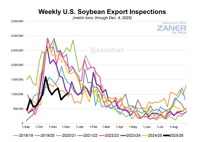 Corn and beans look like they switched seasons. Over 10 mmt of beans inspected so far in 2025/26 as of Nov. 13. As of Sep. 25, total sales were at 11.9 mmt. How much of the sales ledger has been shipped so far is a mystery and will remain that way for weeks, unfortunately.