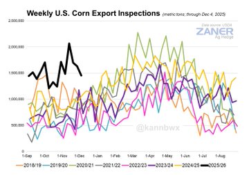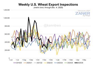 Soybeans avoid another "18-year-low" metric. Corn inspections continue at a jaw-dropping pace. Wheat inspections remain respectable - better than in the last few years as they should be - 25/26 wheat exports are predicted to reach a 5-year high.