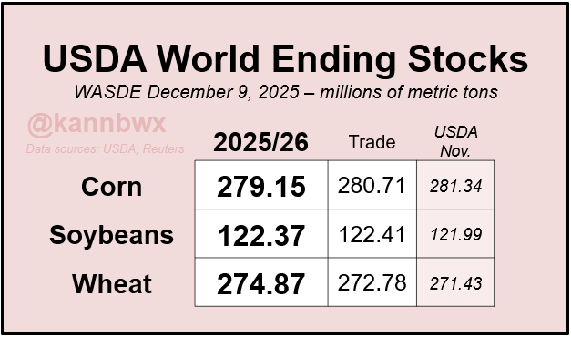 USDA cuts U.S. corn ending stocks (exports went up 125 mbu), but soybean stocks were unchanged as were soy exports. U.S. wheat stocks also unchanged.