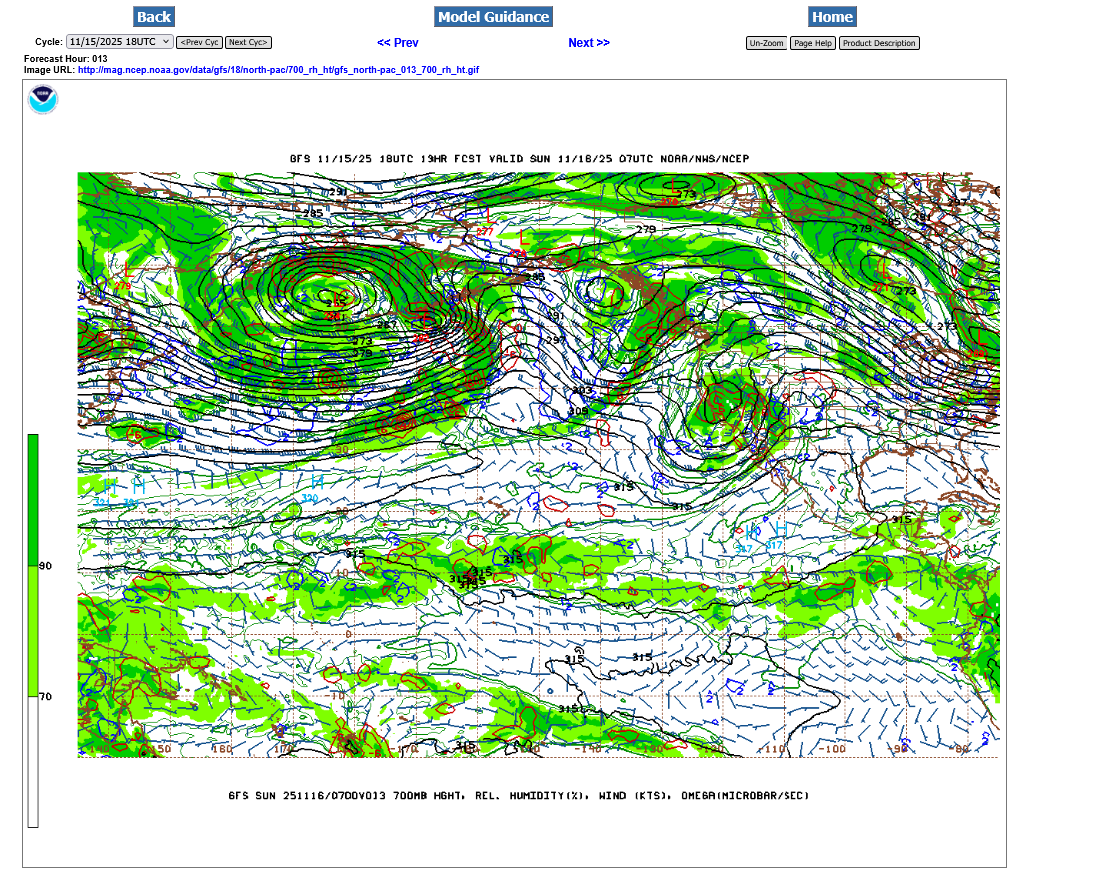 Below: Moisture/relative humidity at 700 mb. With an atmospheric river, we would see a long trail of green in the Pacific aimed at the coast. It would be associated with the pattern at the top, which would feature a strong and long jet stream aimed at California. This is NOT such a pattern, where a 1,000 mile long plume of moisture is tracking out of the Pacific on the power of a strong jet stream aimed at California.