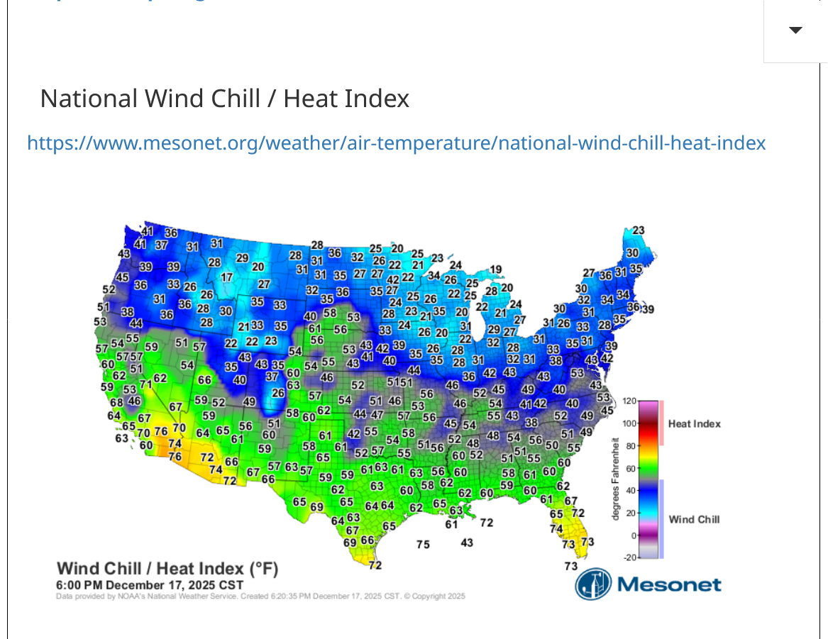 Look how much warmer the early evening temperatures are here on Wednesday, 12-17-25 compared to the map above!!! There are places, like the N.Plains where it feels 60+ degrees warmer right now!!!!