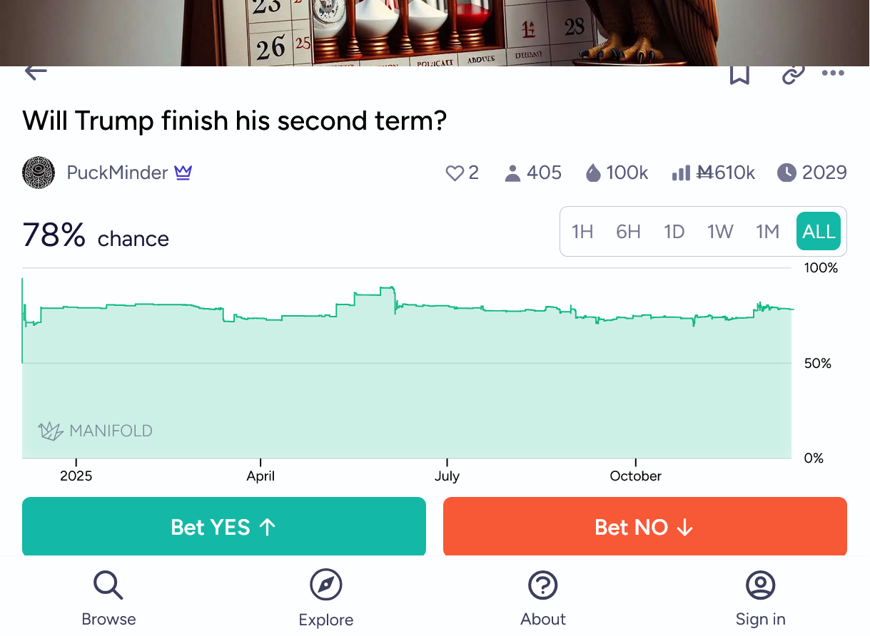 After gaining additional discernment while doing that, I will guess that there's an 80% chance that Donald Trump will NOT finish this term.'