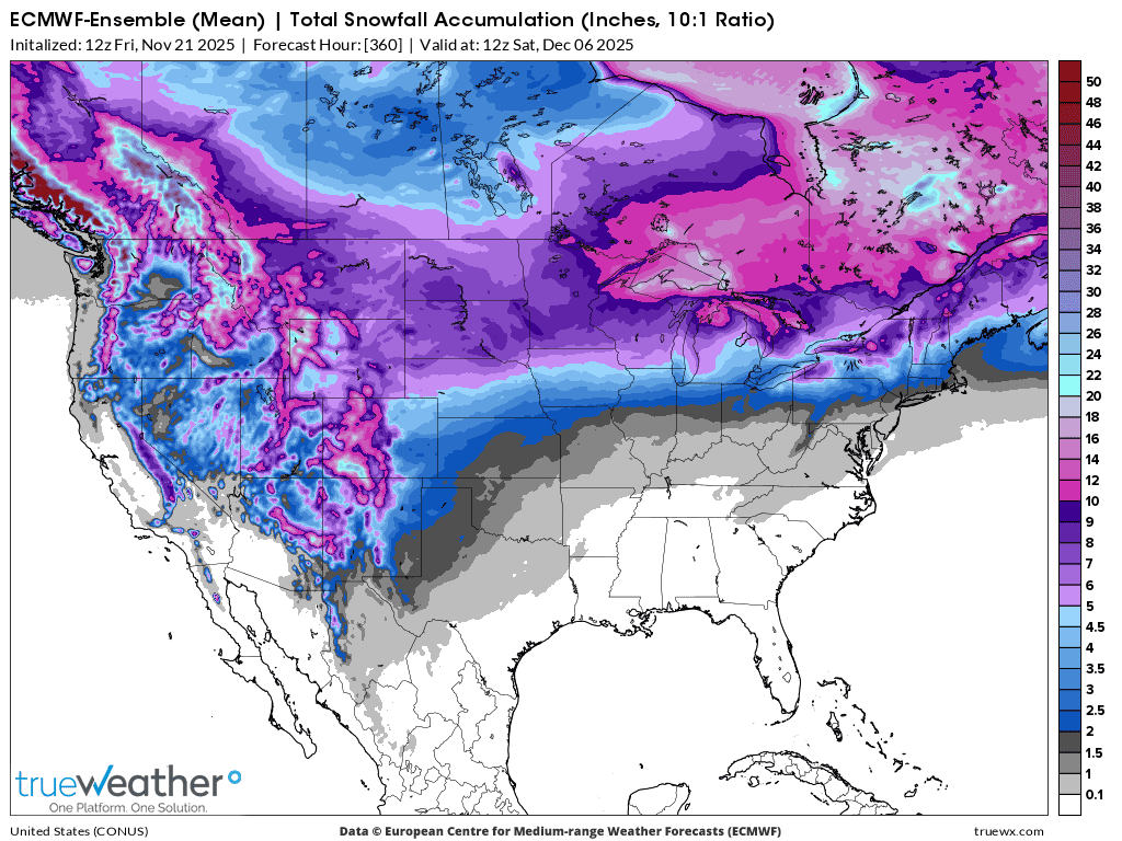 Total snowfall the next 2 weeks from the last 12 European Ensemble model. Most of this is week 2.