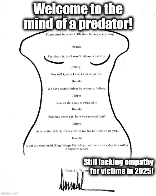 There is no mistaking Donald Trump's thoughts which are crystal clearly those of a predator, admiring his fellow predator, best friend and celebrating their shared views on this, the most important of all message for Jeffrey Epstein on his 50th birthday because it was the one message that Trump decided to send for this milestone!