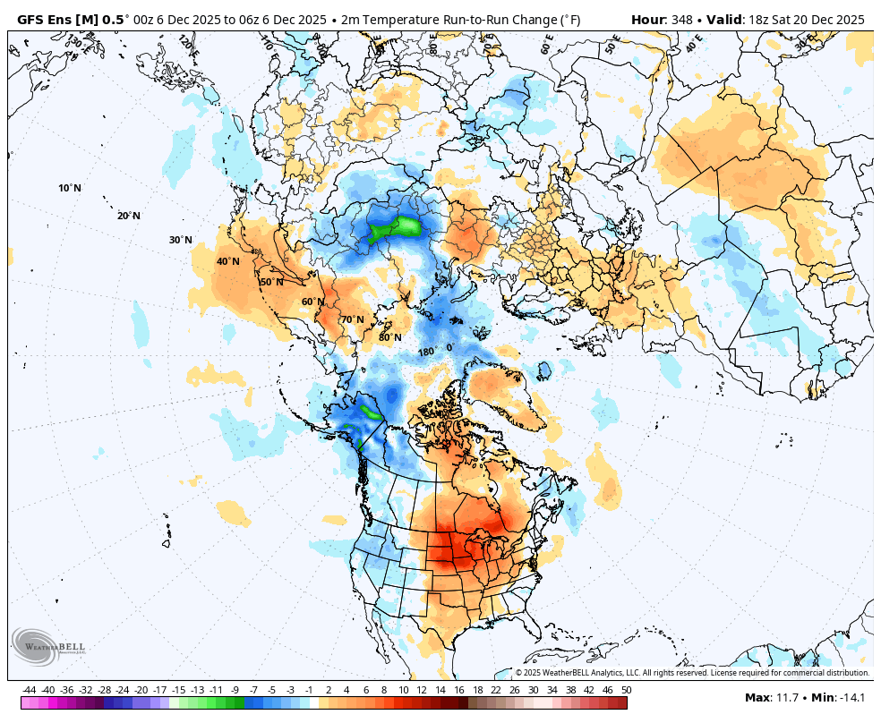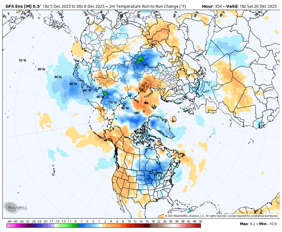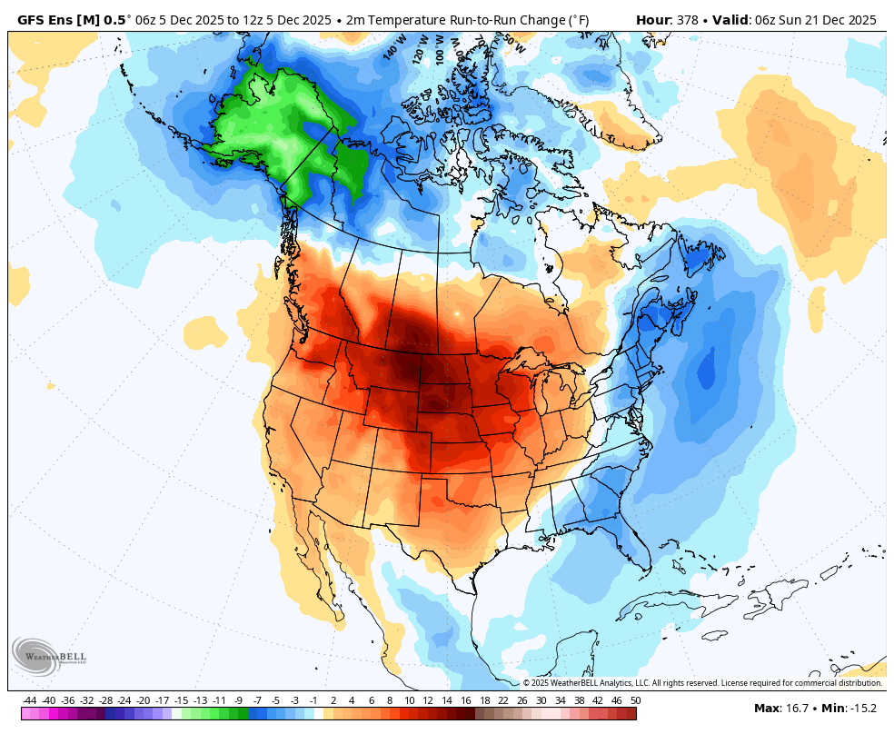 The last 12z GEFS below was +6 HDDs vs the previous 6z and +10 HDDs vs the 0z before that. The last map looks like the setup for some extreme cold in week 3.