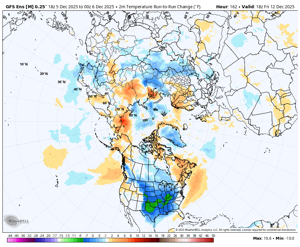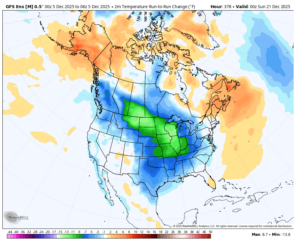 However, the late 12Z EE maps suggest a new supply of very cold air will develop in W Canada, which is in a position to plunge down into the C US soon after. This wasn’t on the prior runs for the comparable period. I suspect that that was a big contributor to the 3% rise.