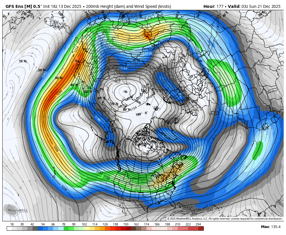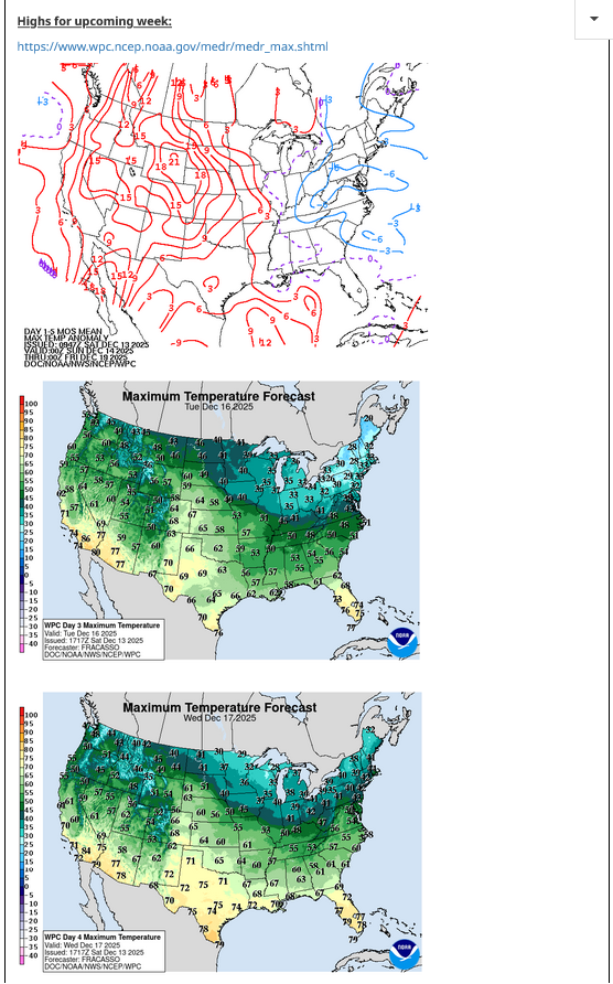 Here's the new pattern below. This is 1 week from today on 12-20-25. Mild, Pacific(oceanic) air masses will spread from west to east across much of the country. Bitter cold will continue to pool in Canada and some of that will leak/ooze just south of the US border, undercutting the main jet stream in the lower levels but that cold will not have much push to penetrate very far south as it moderates over bare ground.