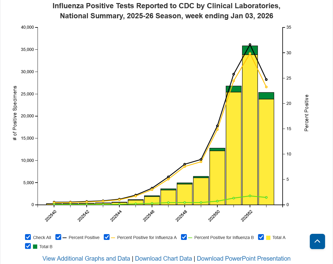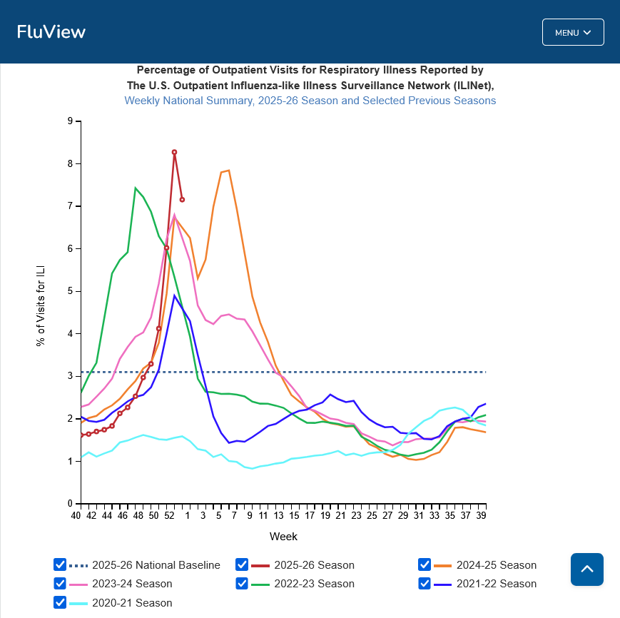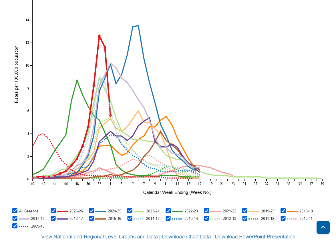 For this particular week, here in early 2026 we are close to the highs in previous years at this time. I noted there is no graph for the 2020-21 season. COVID hit hard, starting in March 2020 so we can assume that the CDC had all hands on deck focusing on COVID cases and neglected the flu that year.