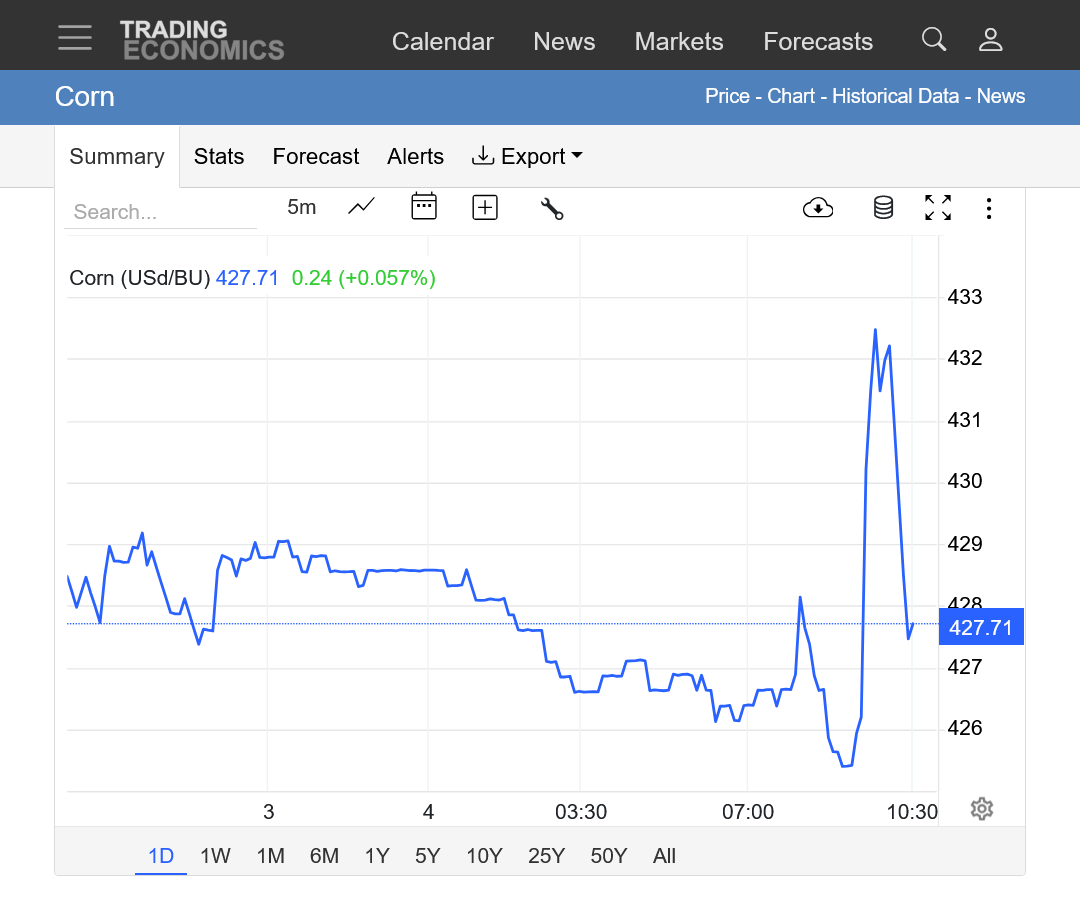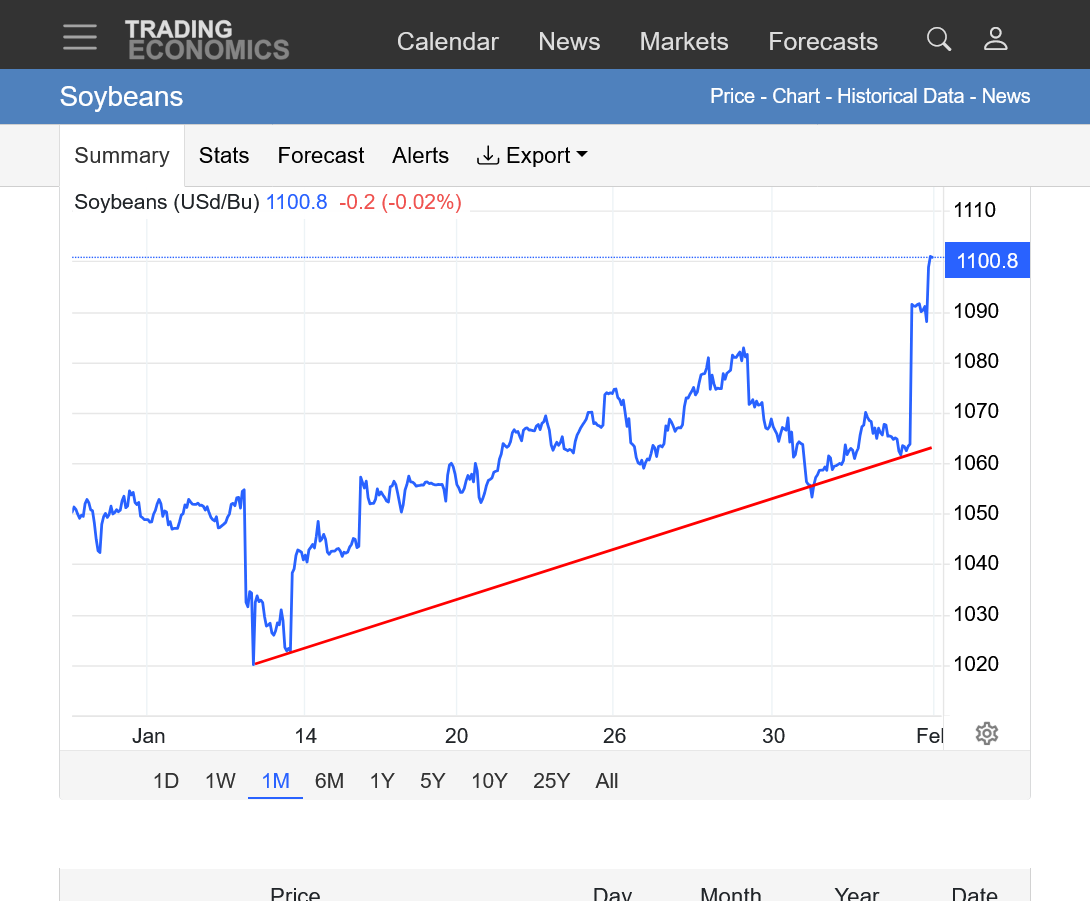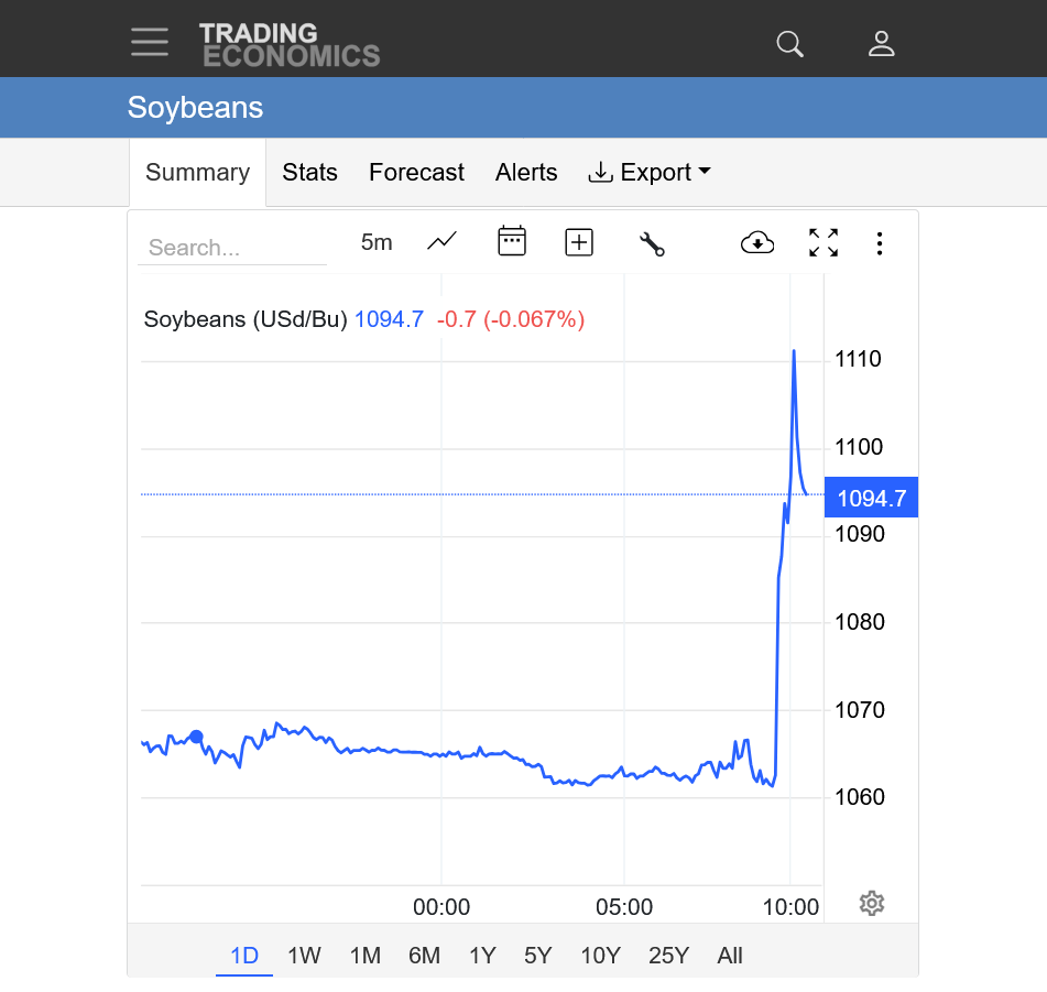 At 9:39 am CT(the time stamps here are ET) beans took off like a rocket. SH26 was up by almost 50c at the peak, now up around 30c. Can't find the news yet but this WAS from news.
