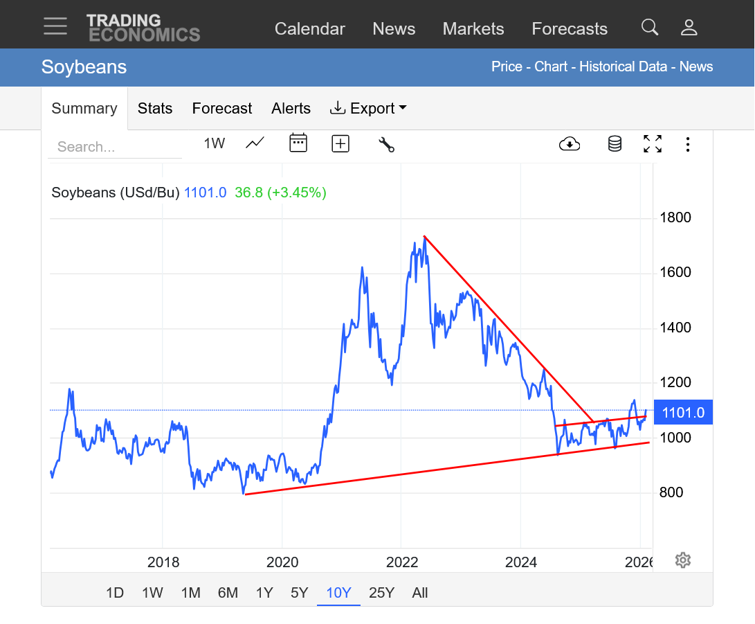 Conab reduced Brazil's 2025/26 soybean harvest by 1 mmt from last month citing lower yields. 176.1 mmt is still a record and is below USDA's latest estimate of 178 mmt.