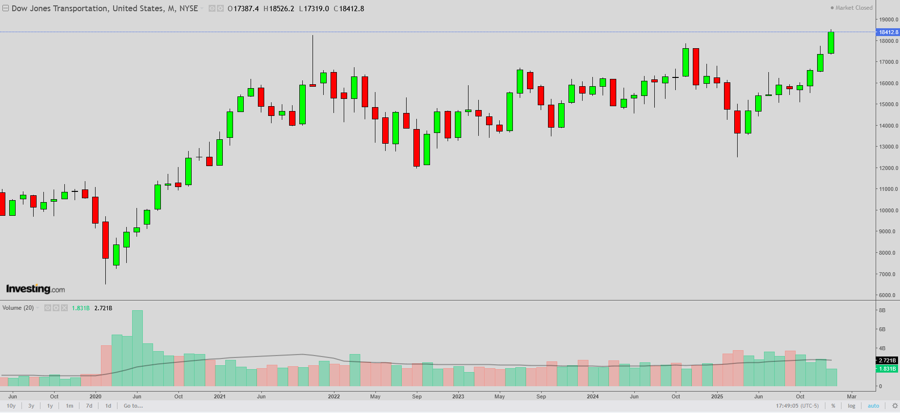 Dow Jones Transports monthly chart: new highs, still leading all majors, generally a good sign for the economy