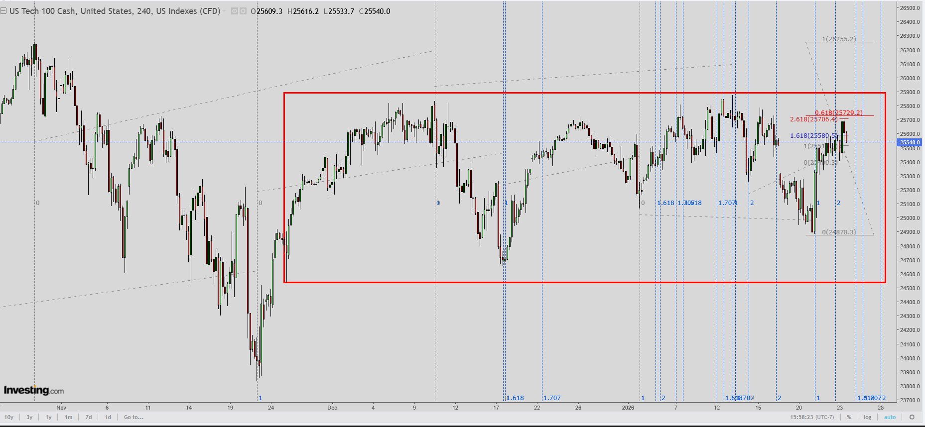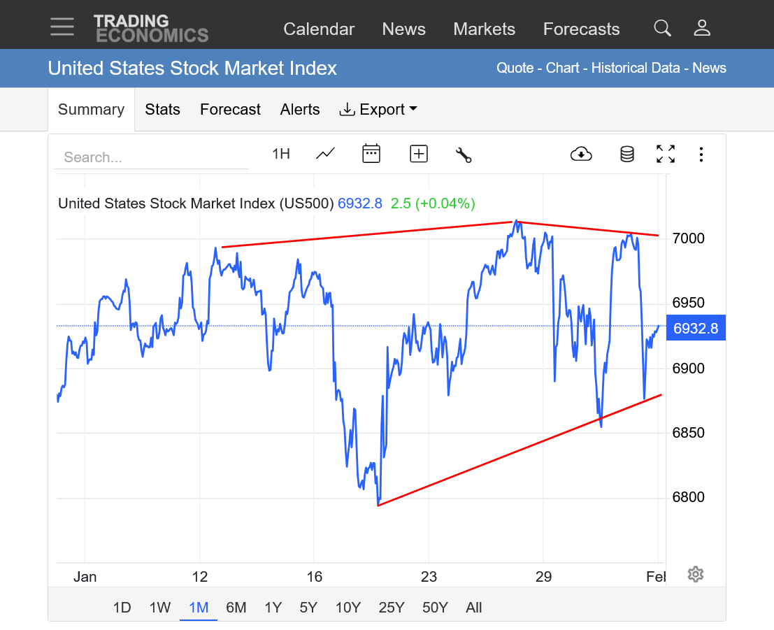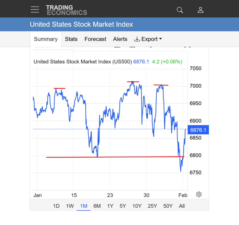 It looked like a potential head and shoulders top(1 top-head, with 2 slightly lower tops on either side-shoulders, then the neckline support being the 2026 lows.