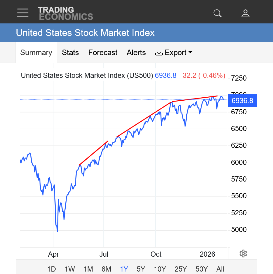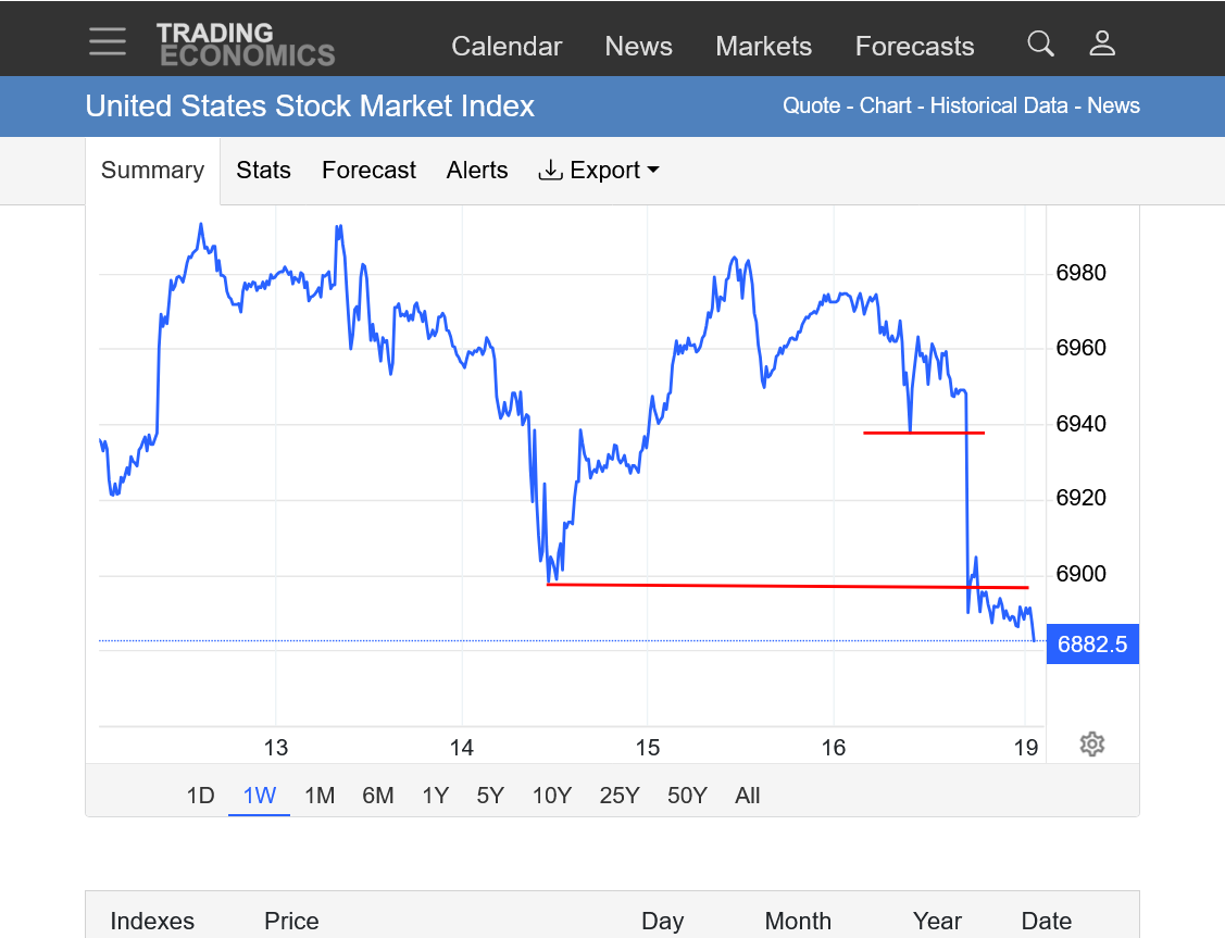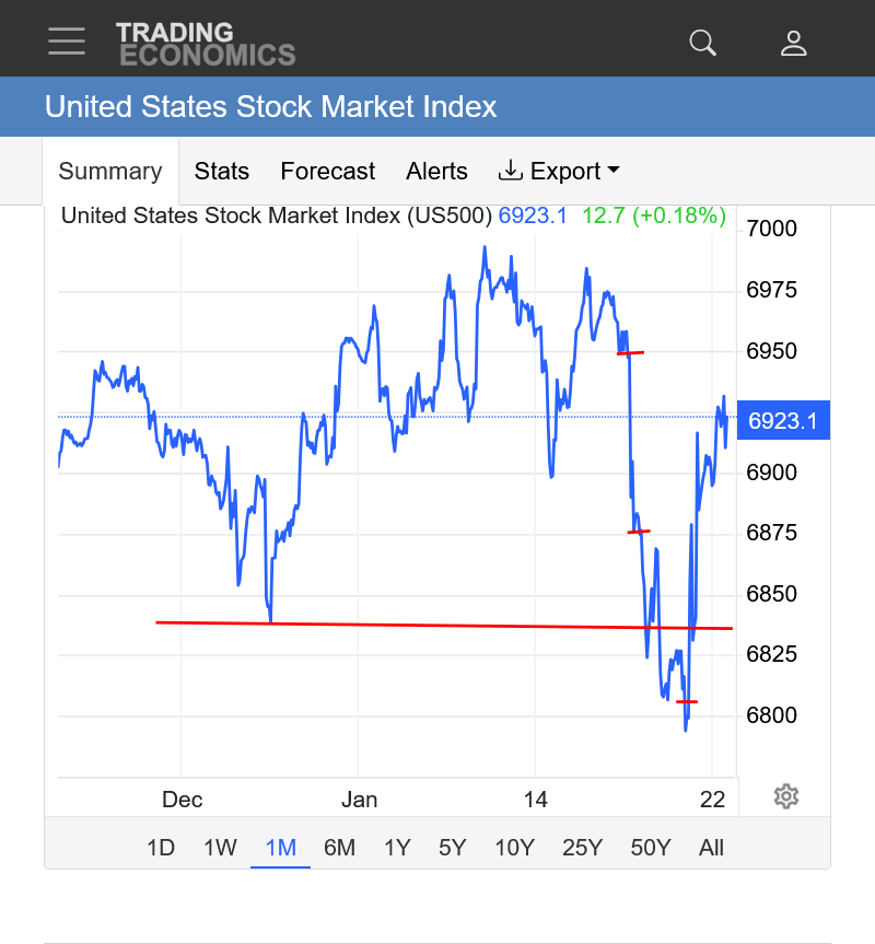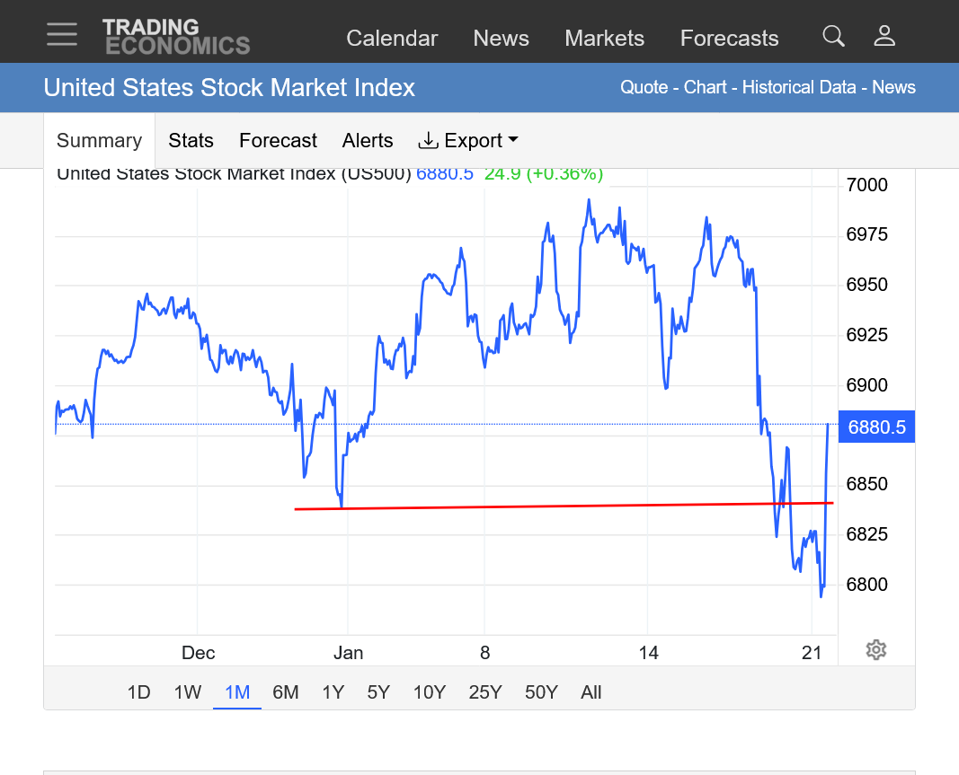 The news today from the link below: "US stocks were higher on Wednesday, trimming the sharp loss from the previous session as markets reassessed their pivots away from US assets following fresh remarks from President Trump in the World Economic Forum. The S&P 500, the Dow, and the Nasdaq 100 were nearly 1% higher. Trump stated the US would not use force in its mission to get Greenland, triggering some respite for US equities and sovereign bonds"
