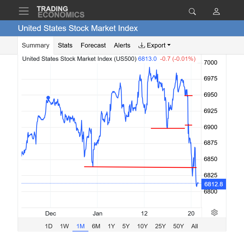 Long red line: January low. We spiked below that but Donald Trump changed his Greenland position to reverse the market higher yesterday.