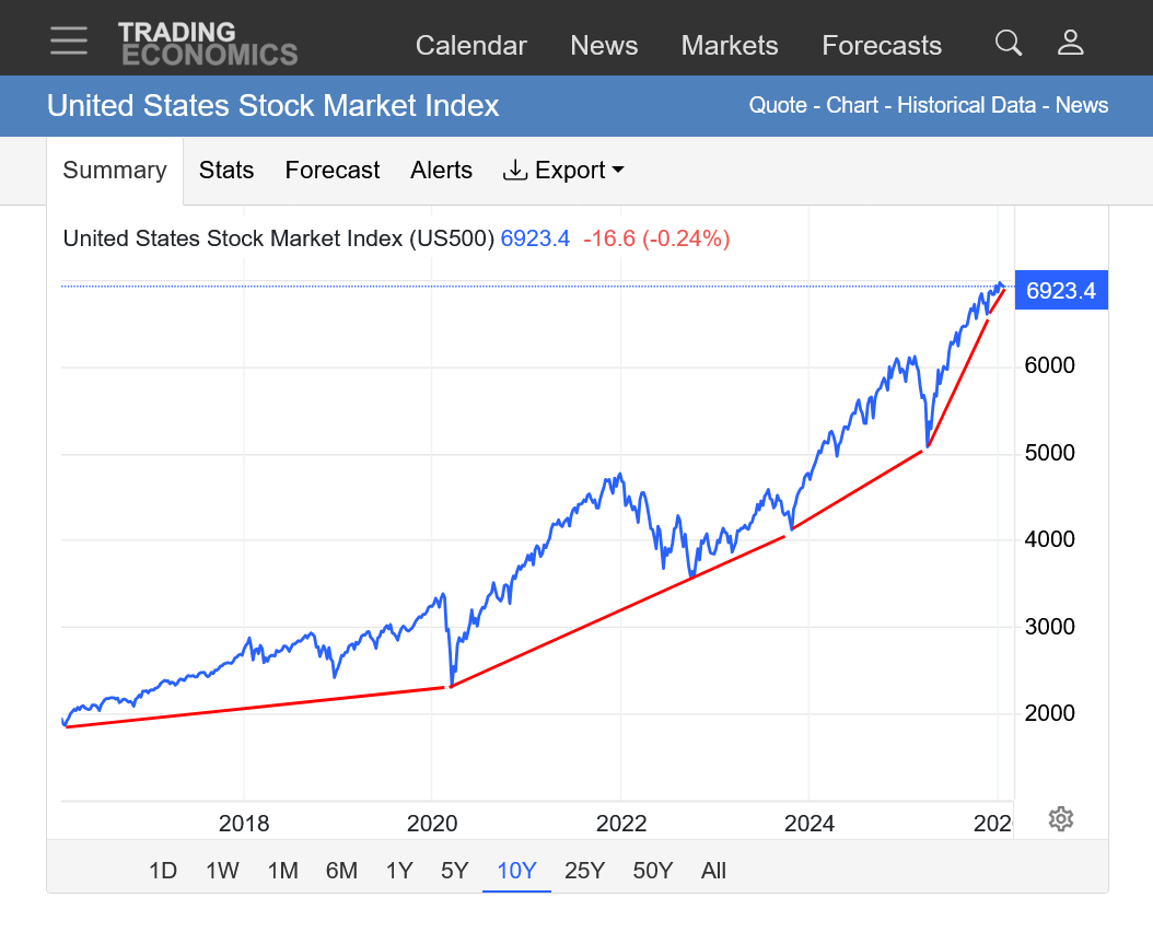 3. 10 years. Still a very strong uptrend that had been steepening but is starting to lose momentum. The previous parabolic type move with a steepening uptrend is morphing to a decelerating/flattening slope.