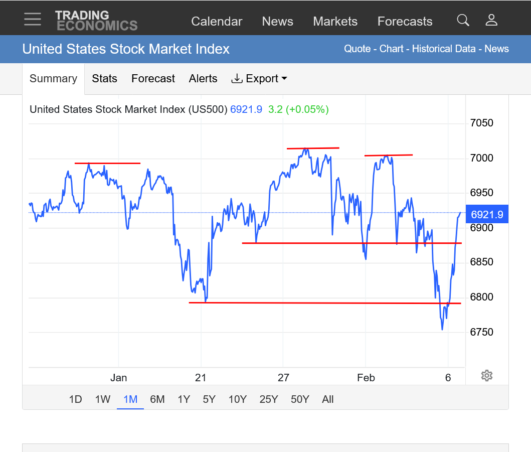 1. 1 month. We spiked thru but successfully held the January lows. Currently sitting just above mid-range for January, close to the high for this week but we haven't quite filled the gap down on Sunday Night. We really need to close above around 7000 (new highs) to look bullish again.