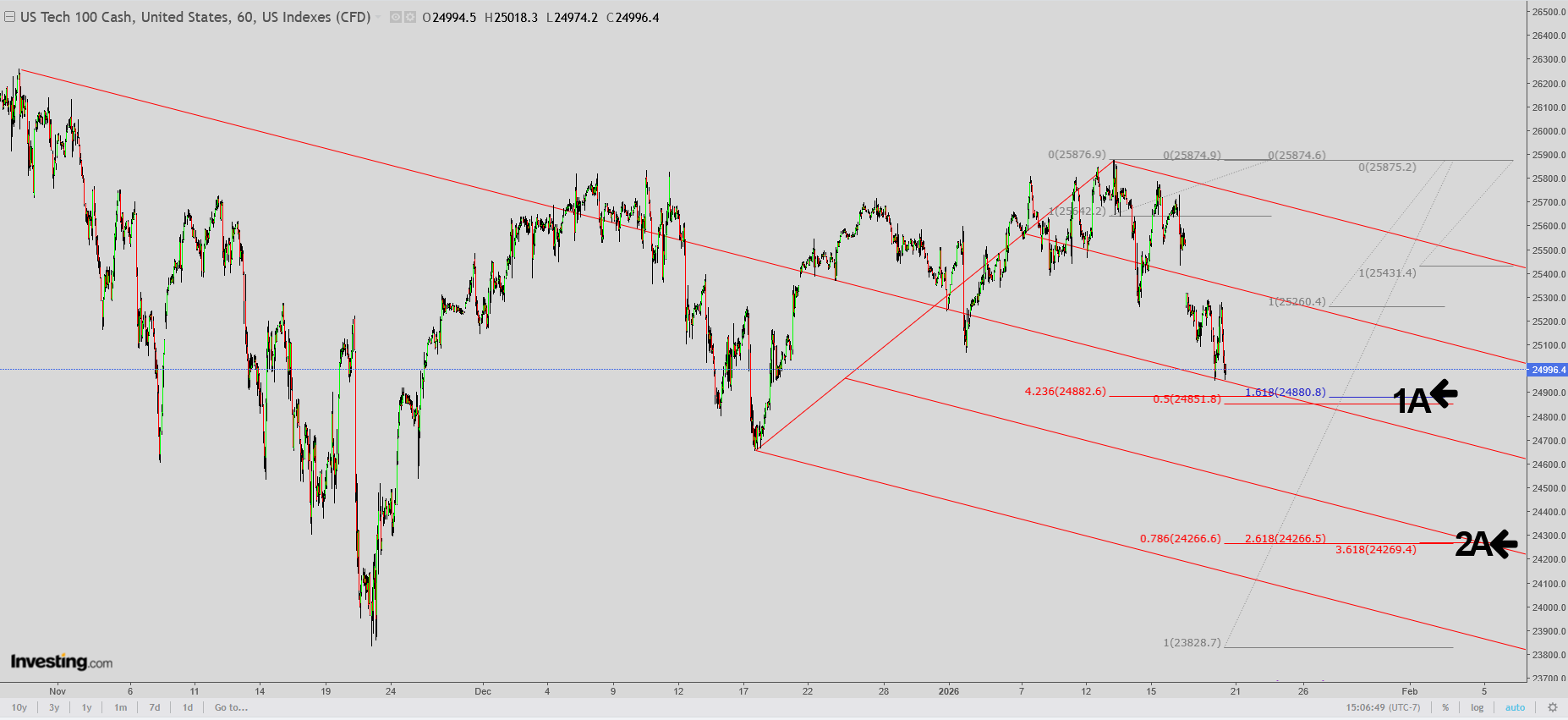 1. 1 month chart: Donald Trump Greenland chaos gap lower of the right with Friday's lows and Sunday's open/highs. Upper, long red line was last weeks low. Lower red line was January's previous low.
