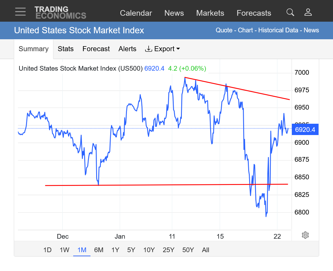 The news today from the link below: "US stocks were higher on Wednesday, trimming the sharp loss from the previous session as markets reassessed their pivots away from US assets following fresh remarks from President Trump in the World Economic Forum. The S&P 500, the Dow, and the Nasdaq 100 were nearly 1% higher. Trump stated the US would not use force in its mission to get Greenland, triggering some respite for US equities and sovereign bonds"