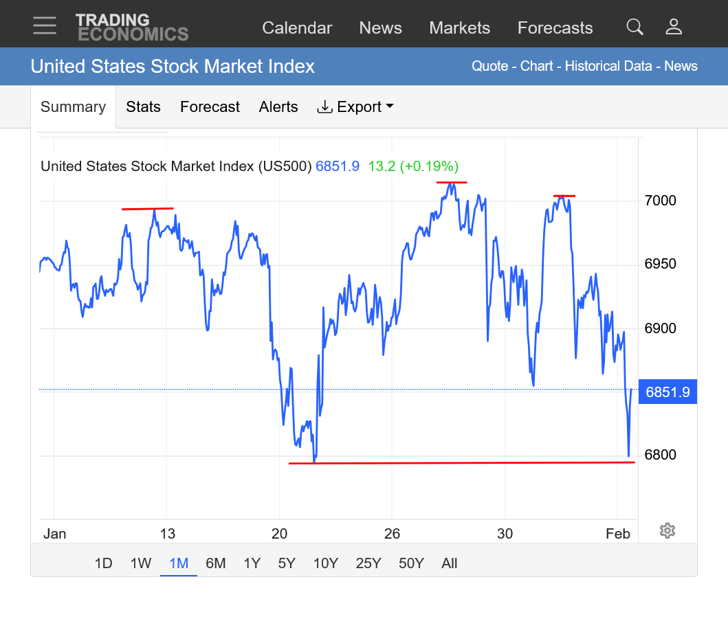 1. 1 month. We spiked thru but successfully held the January lows. Currently sitting just above mid-range for January, close to the high for this week but we haven't quite filled the gap down on Sunday Night. We really need to close above around 7000 (new highs) to look bullish again.