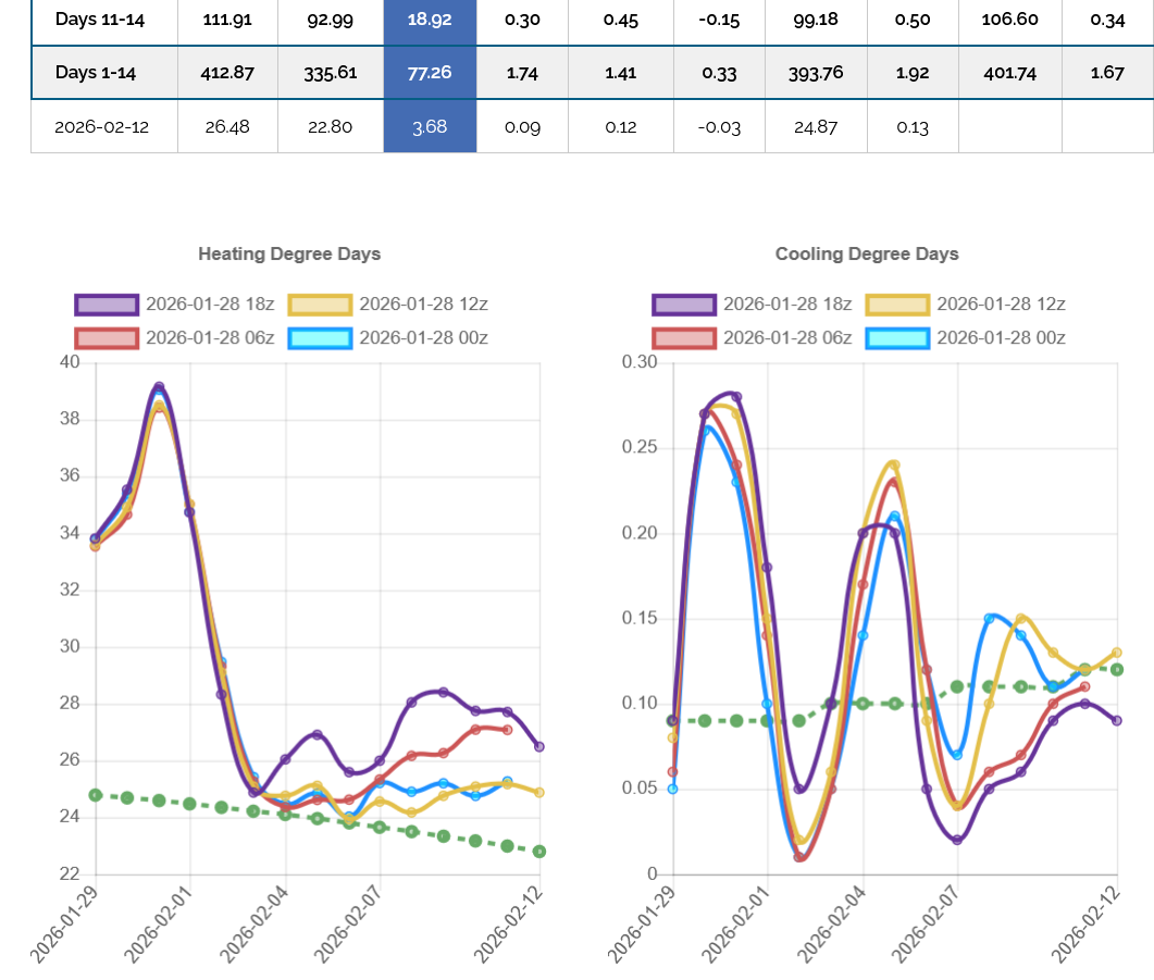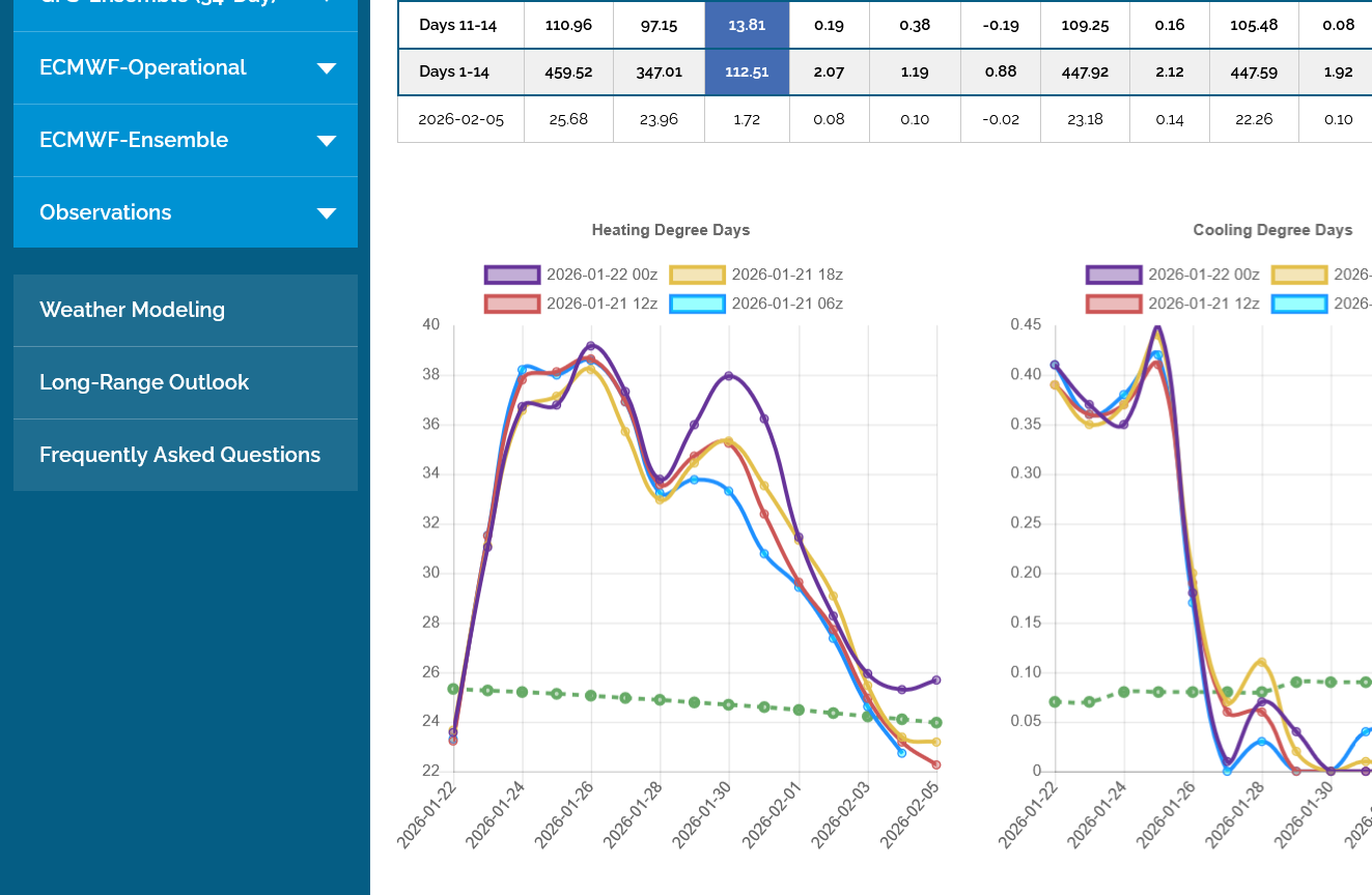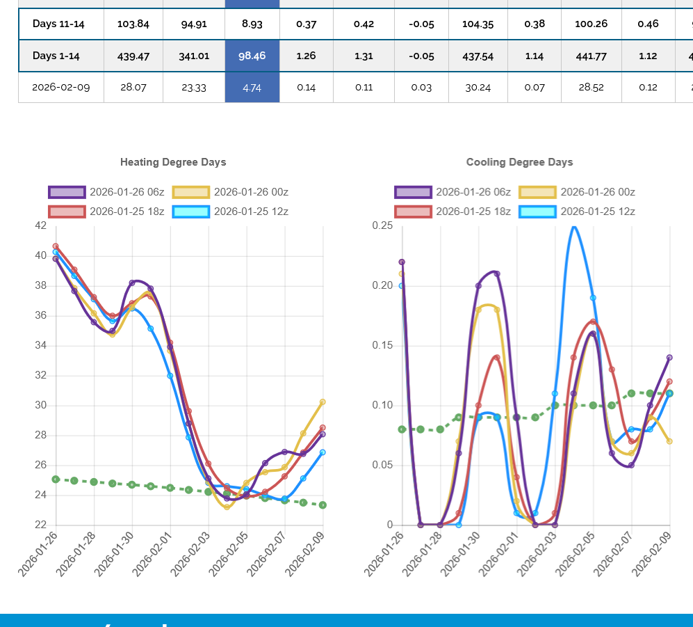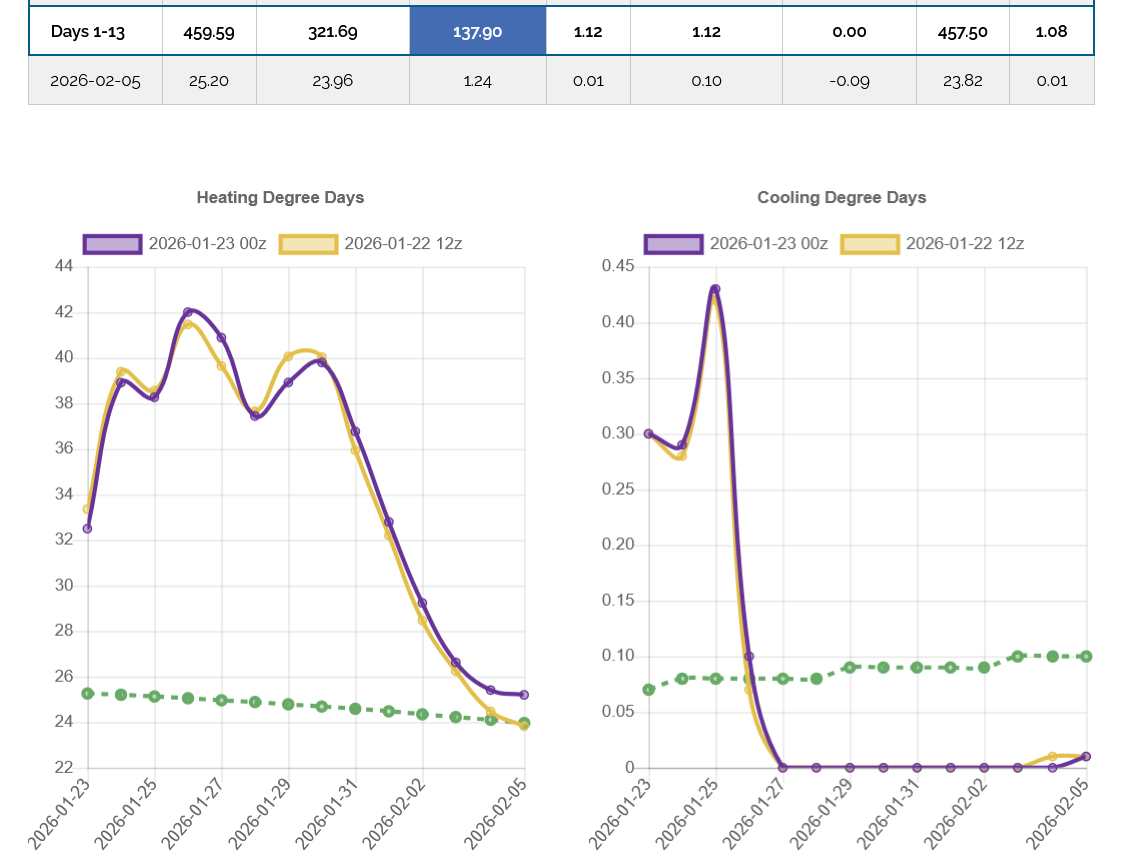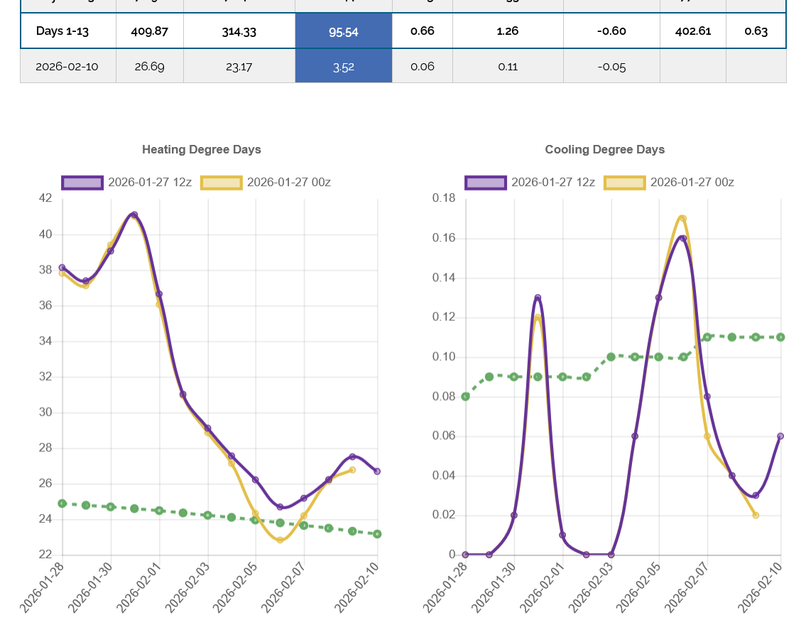 The 12z European Ensemble model (purple/left) had -6 HDDs compared to the previous 0z run,