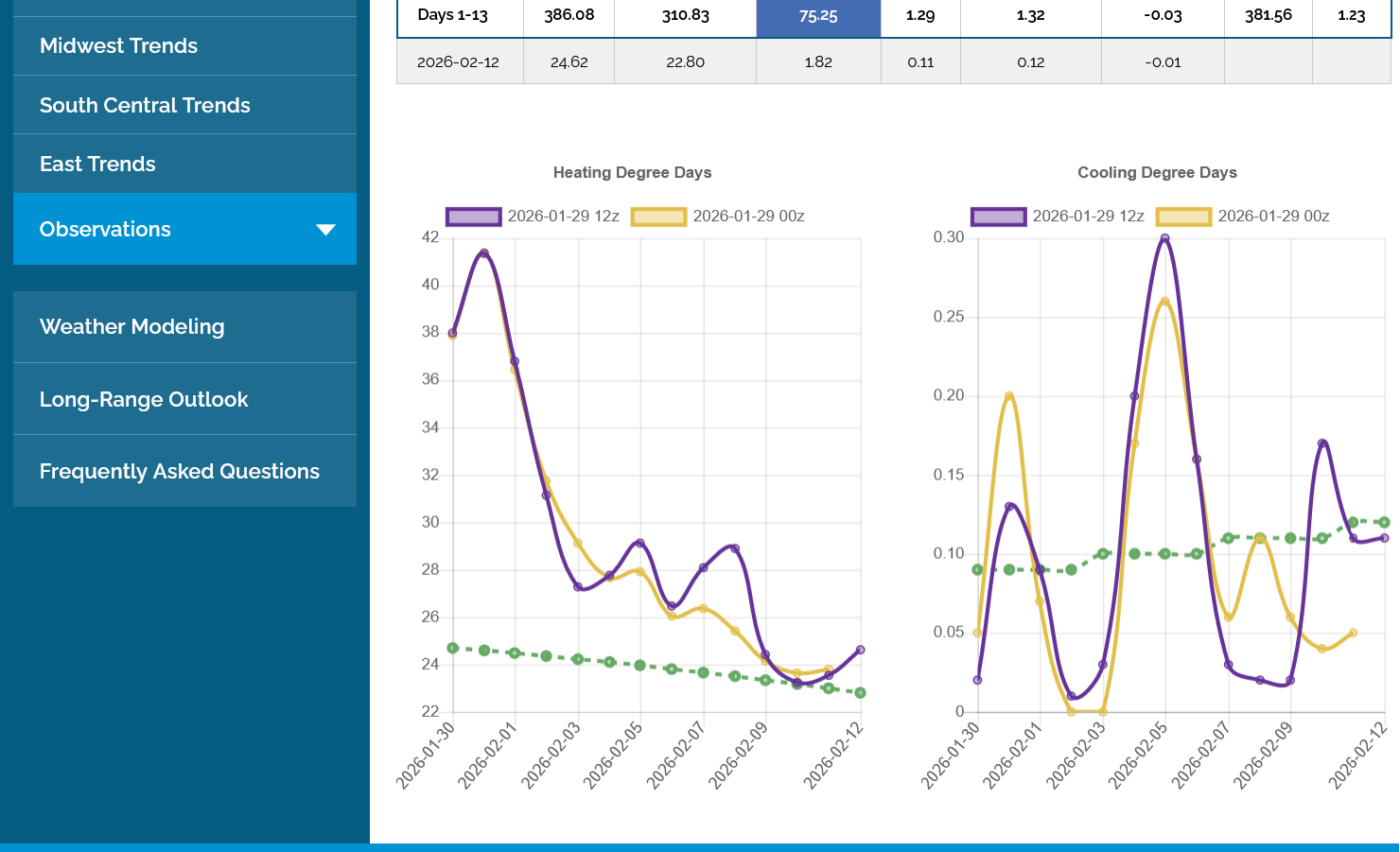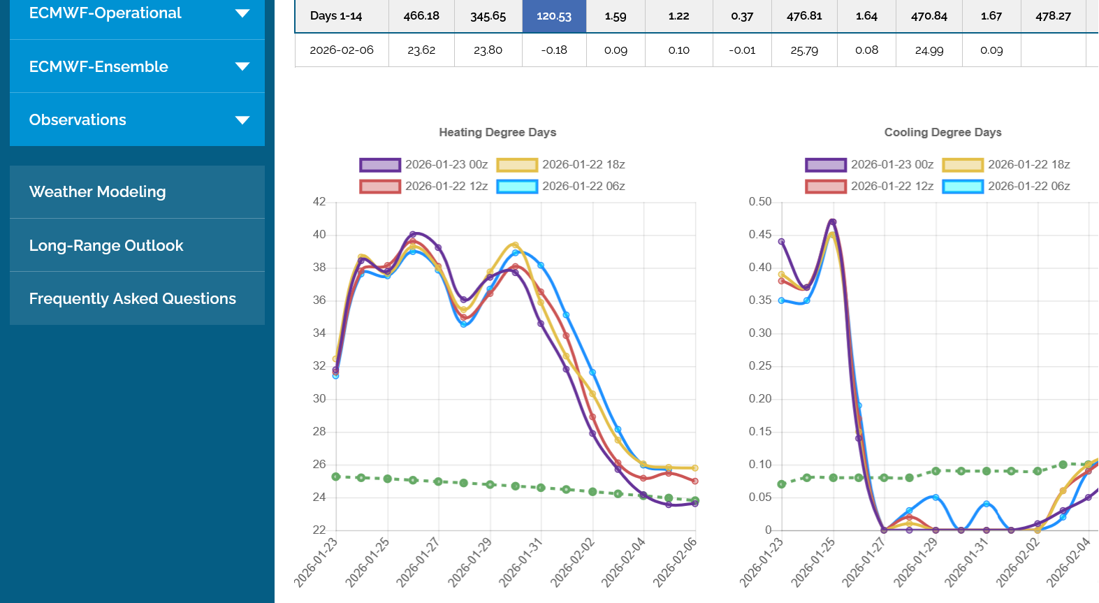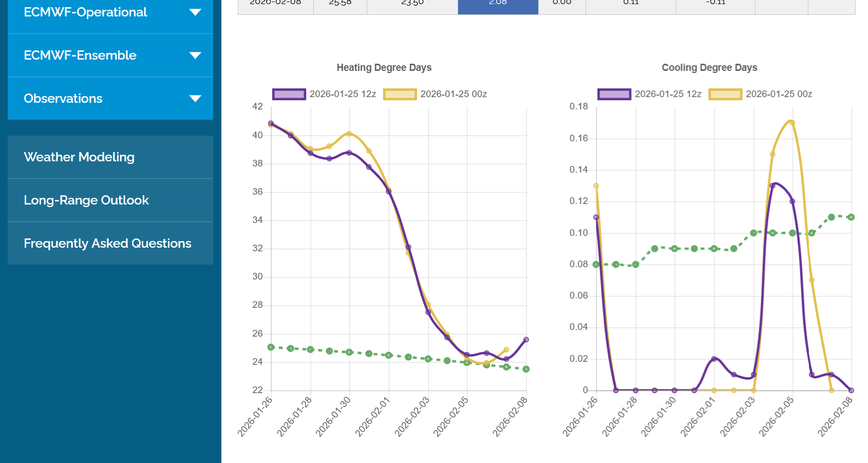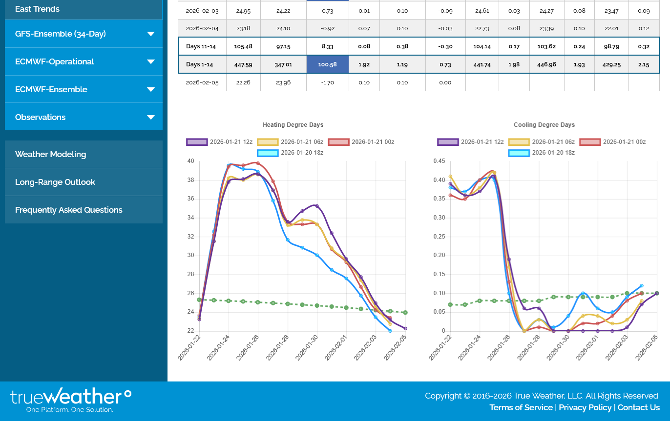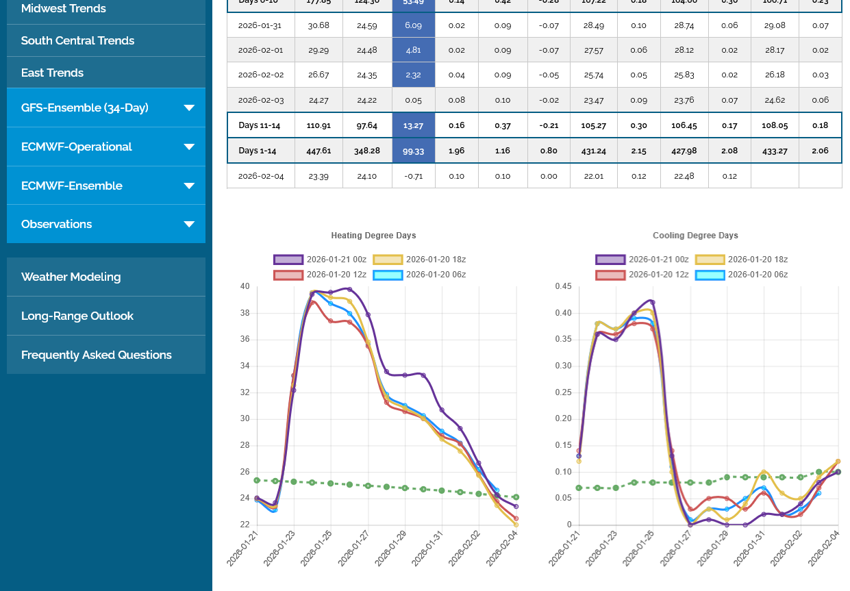 The 12z European Ensemble model (purple/left) had -6 HDDs compared to the previous 0z run,