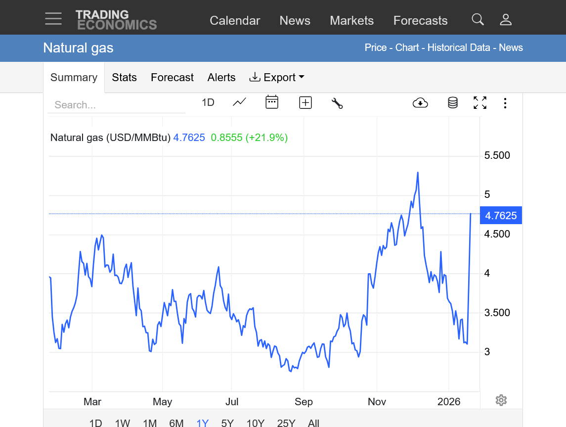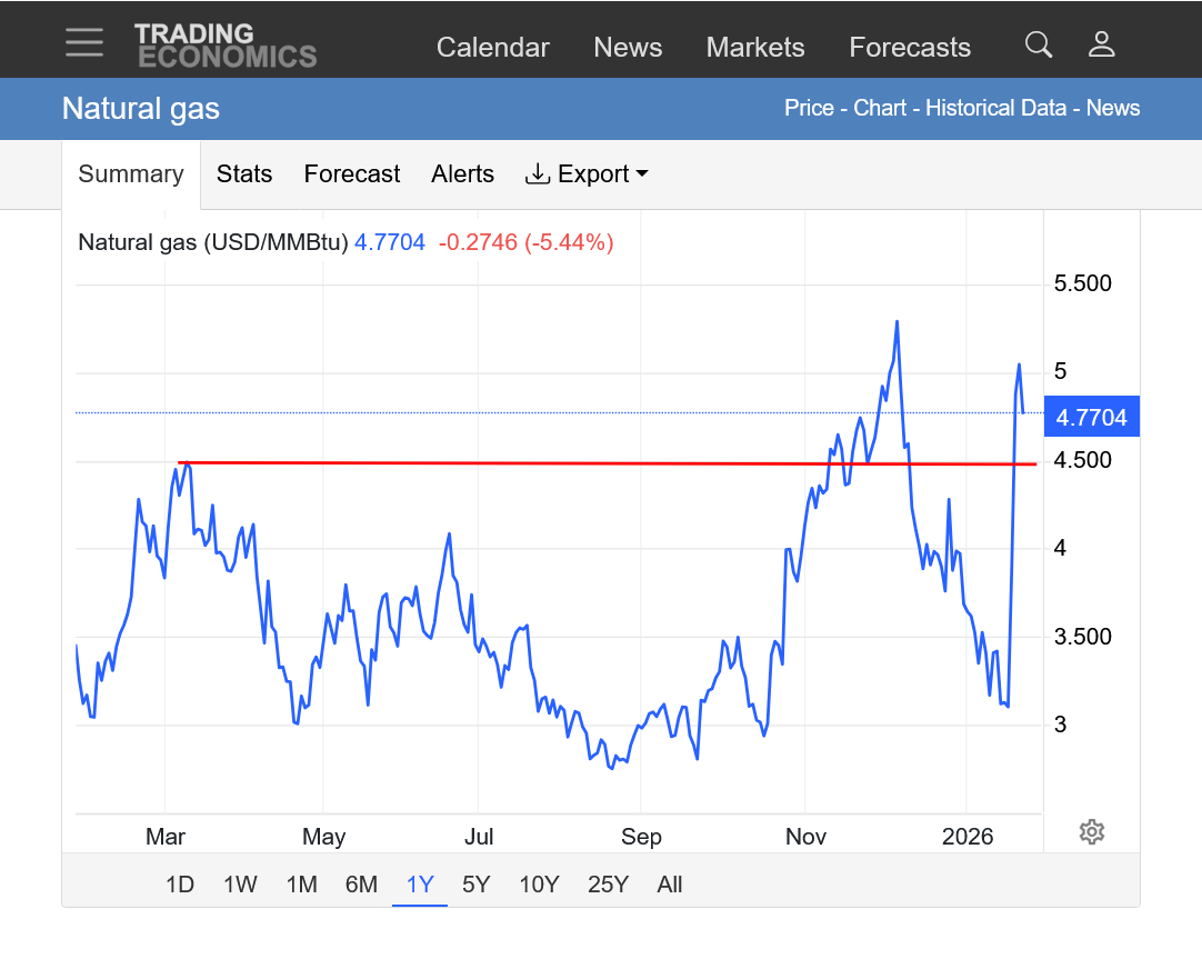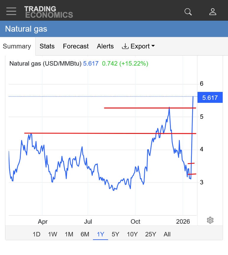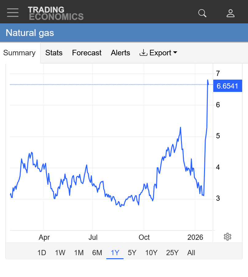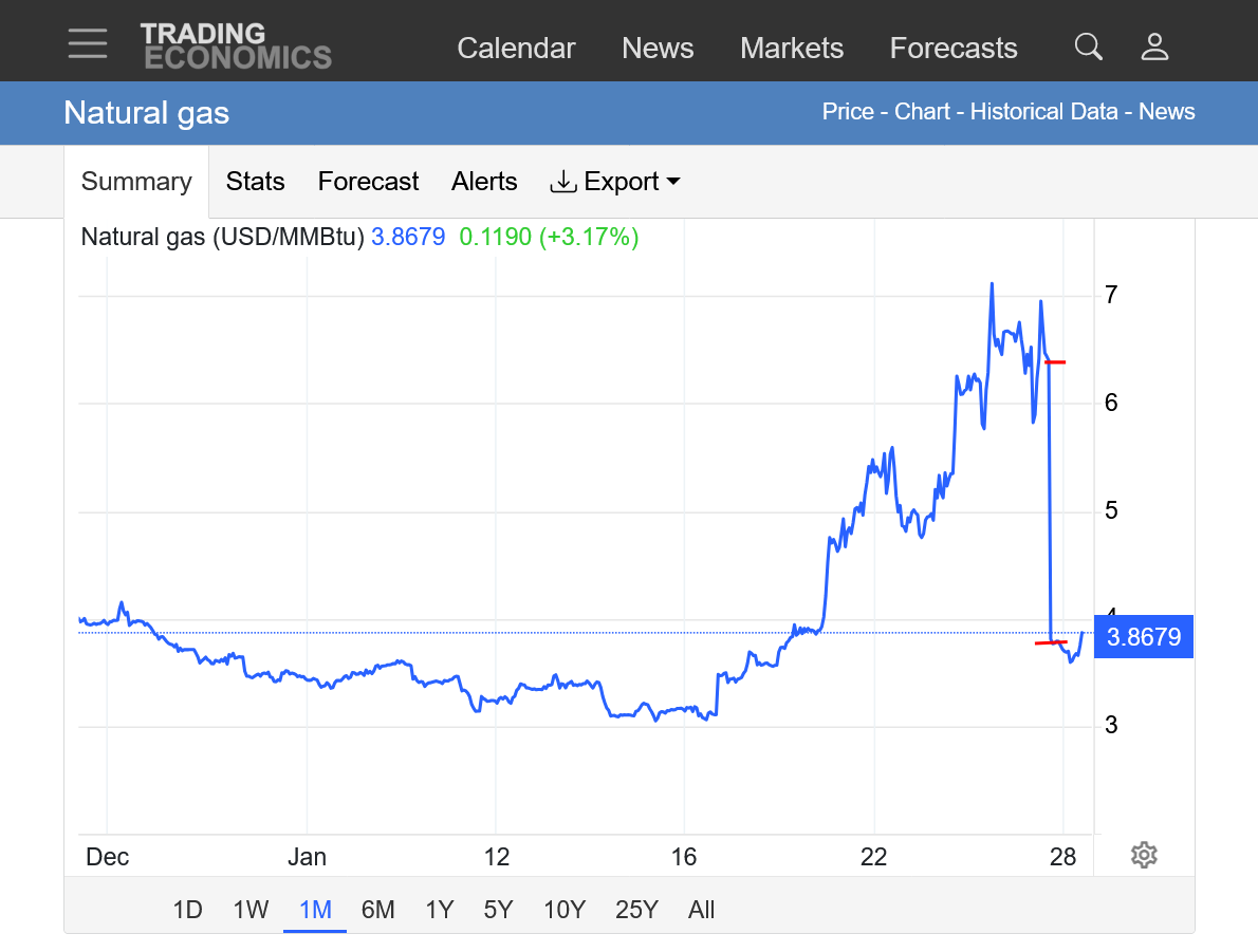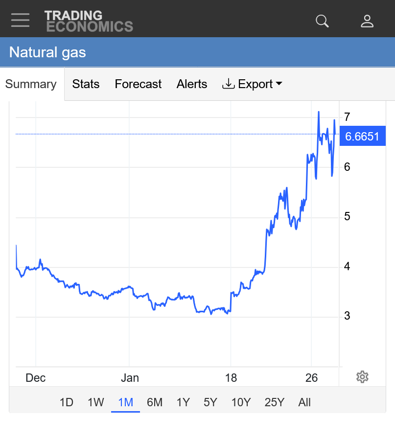 The reality, is that March natural gas had a spike high of $4 this week and we are not far from it. The Feb contract graphed below, spiked close to $7.5, actually HIGHER than depicted below. This source has been rendered unreliable and not helpful(other than to demonstrate what I'm pointing out about what just happened). I will show it again when its able to do better.