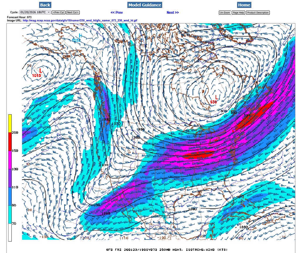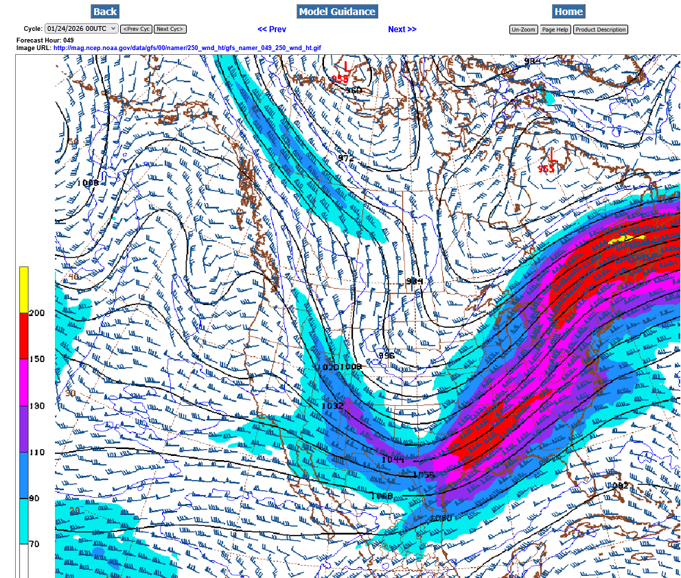 2, On Saturday, thanks to the 2 streams phasing, the magnitude of the highest jet streak winds jumps from just over 200 mph to 250 mph in around 24 hours. The units/colors below are in KNOTs. 5 knots = 6 mph. There's even a bit of yellow the top color in the jet streak/center.