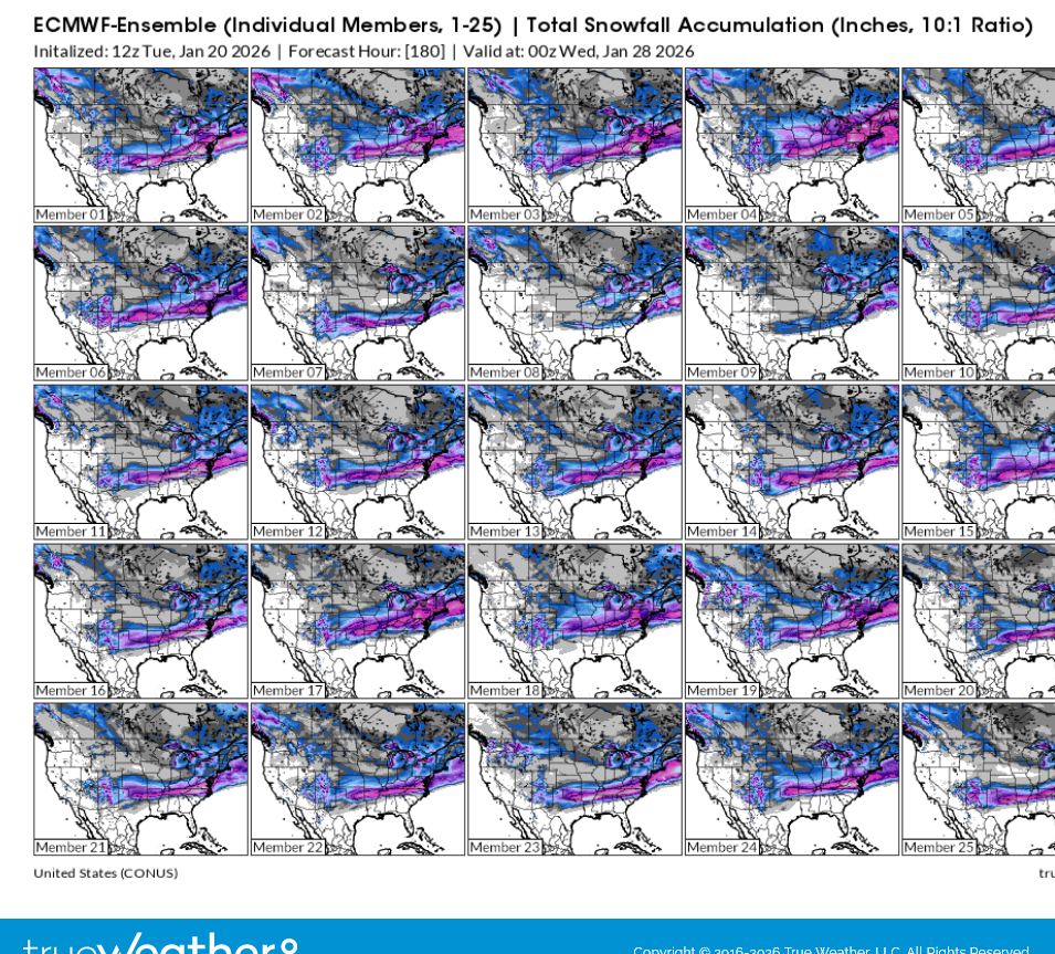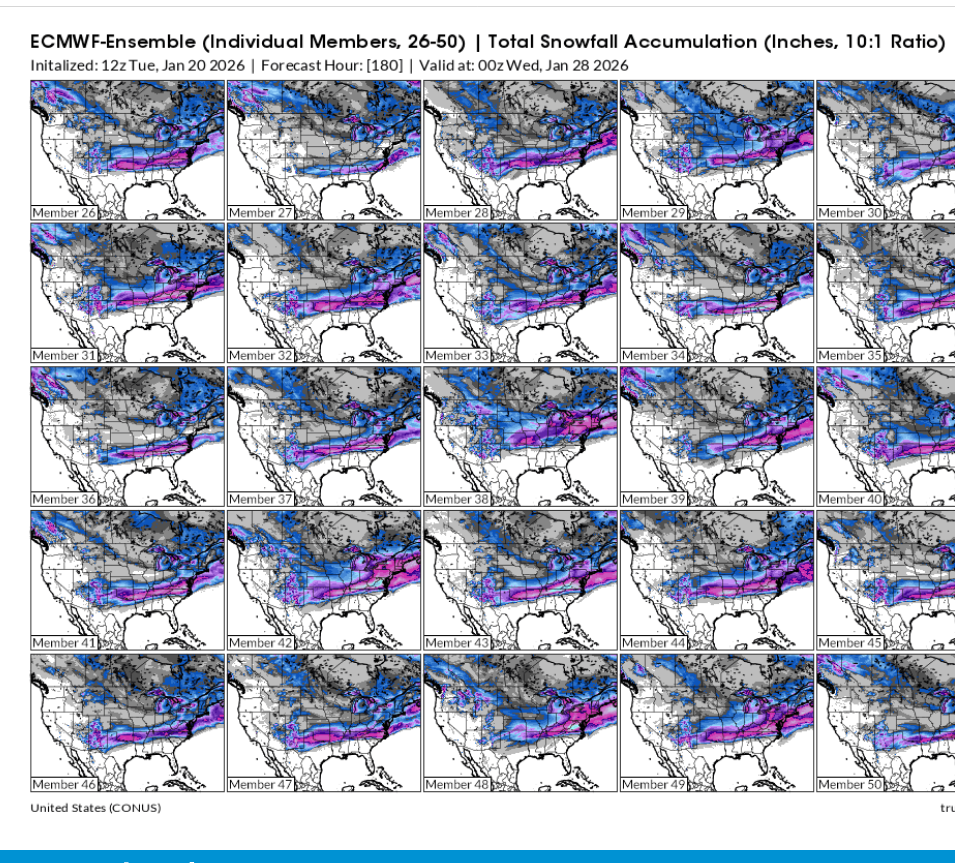 The European Ensemble Mean consists of 50 different variations of the parent model. Each one slightly tweeks a few of the equations of the many thousands because, although we clearly understand almost all the physical laws that control the atmosphere and can represent them with thousands of different mathematical equations(calculus), we are unable to apply them to perfectly represent the entire atmosphere under all conditions.