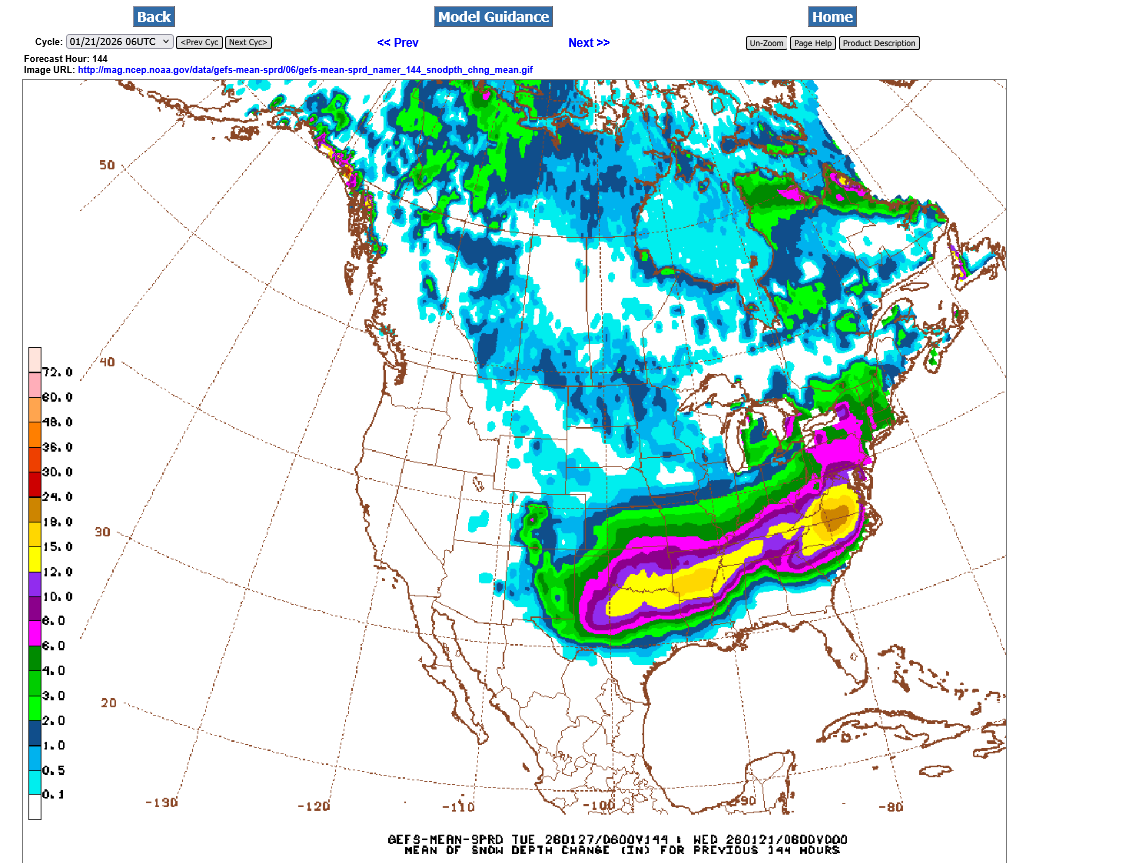 The just out 0z GEFS continues to confirm some hefty amounts in Evansville. The 10+ inch band is just north of the Ohio River. I zoomed in and put the color code below to make it easier to interpret. the yellow is 12+ inches. That red dot in the state of Virginia is 24 inches of snow.