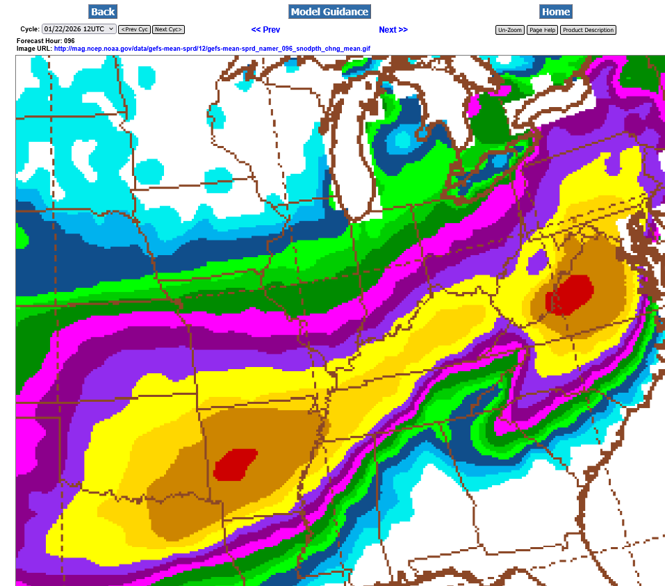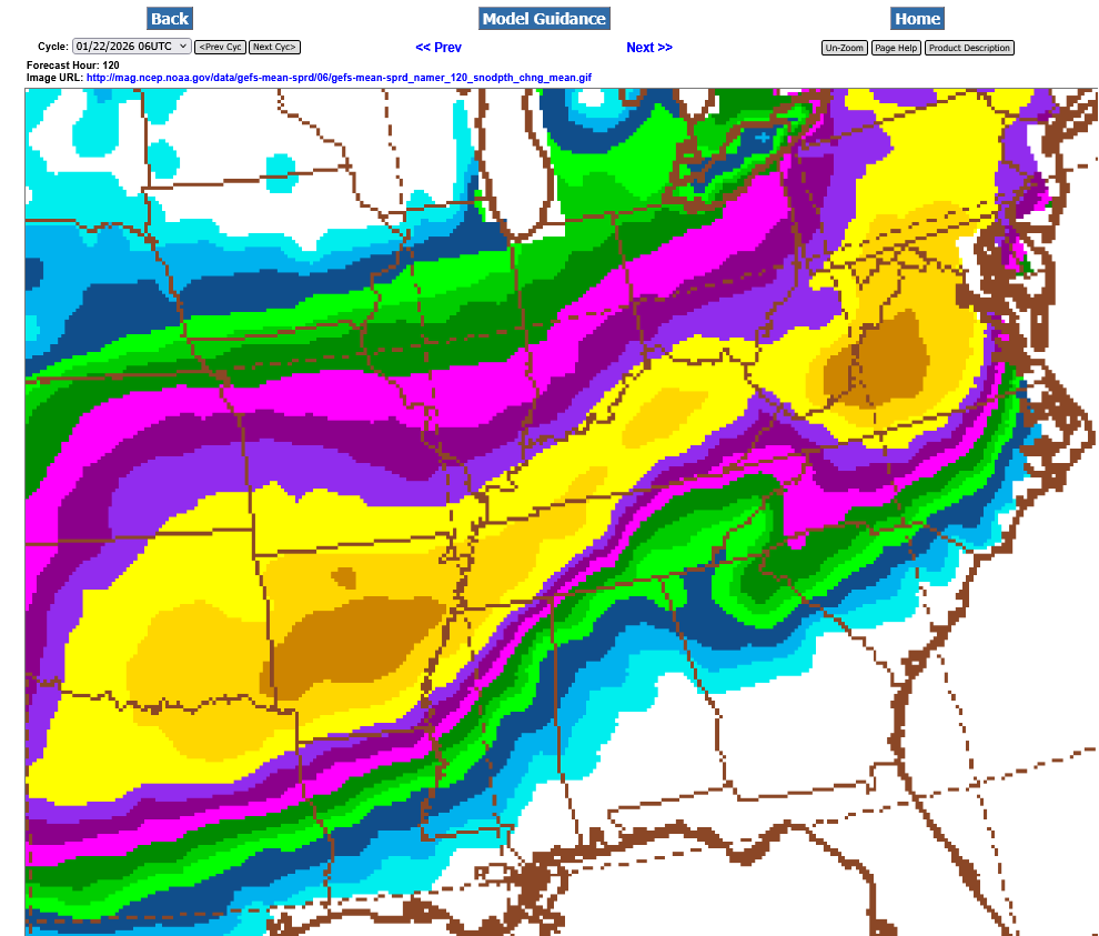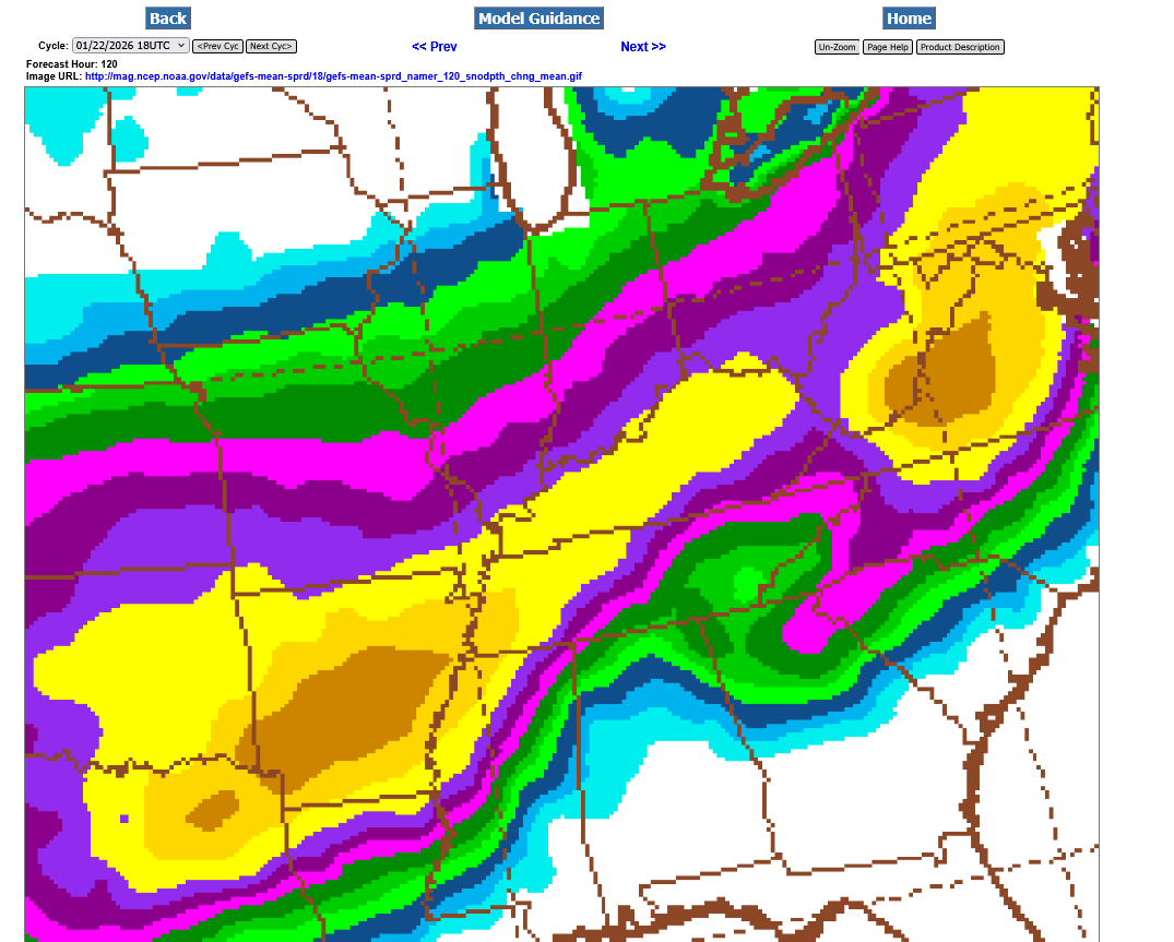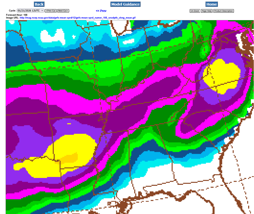 This last 12z GEFS was incredibly different than the previous 6Z run, just 6 hours earlier. Shifting everything even farther south(completely missing S. Indiana with even the northern fringe along the KY/TN border now) and reducing the amounts. Regardless, the yellow is a foot+ of snow and that's enormous for area's that far south.