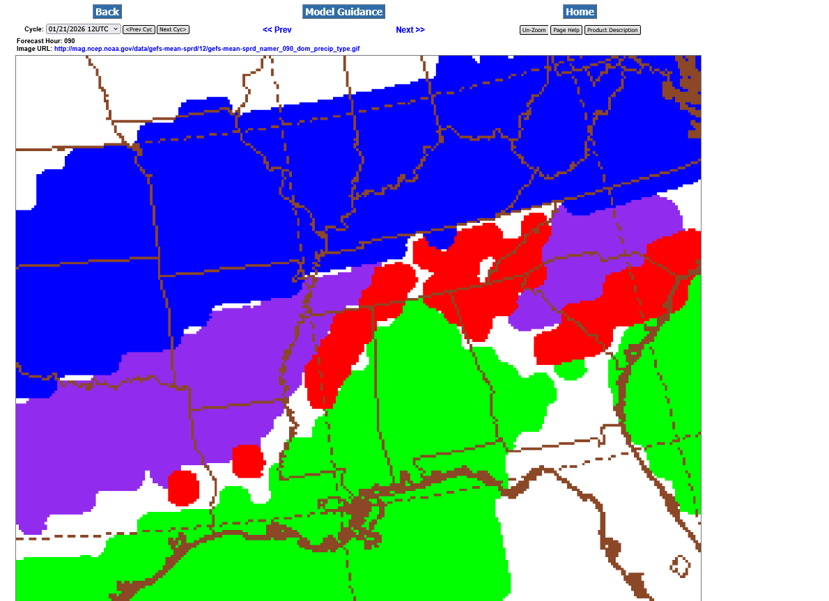 Blue=snow Purple=sleet Red=freezing rain Green=rain