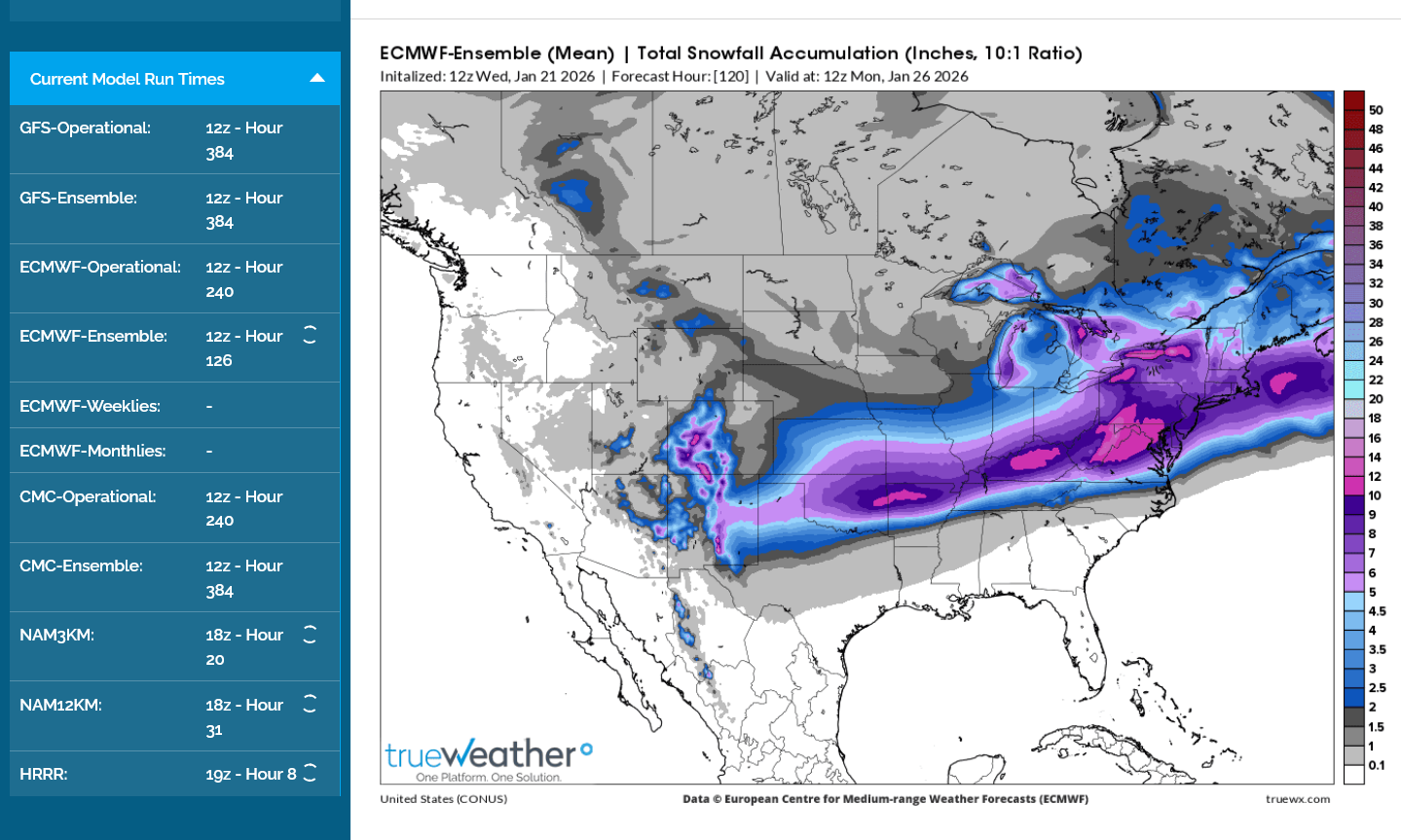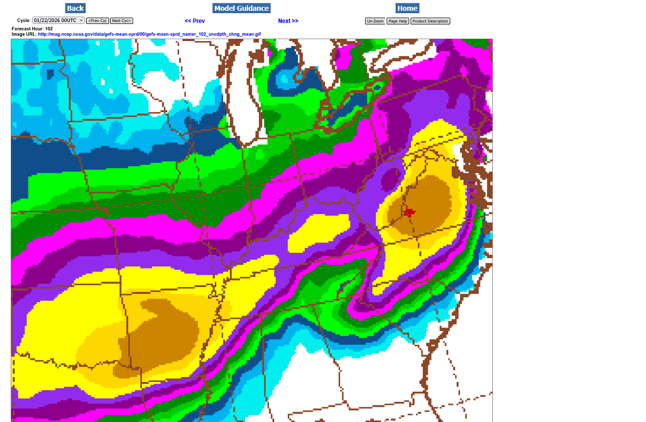 This just updated 12z GEFS run has shifted the 12+ inch, yellow band to the south for the first time in awhile. Maybe this means the snow totals in the forecast have peaked? A foot of snow is likely along the Ohio River and in KY, with totals trailing off gradually headed north.