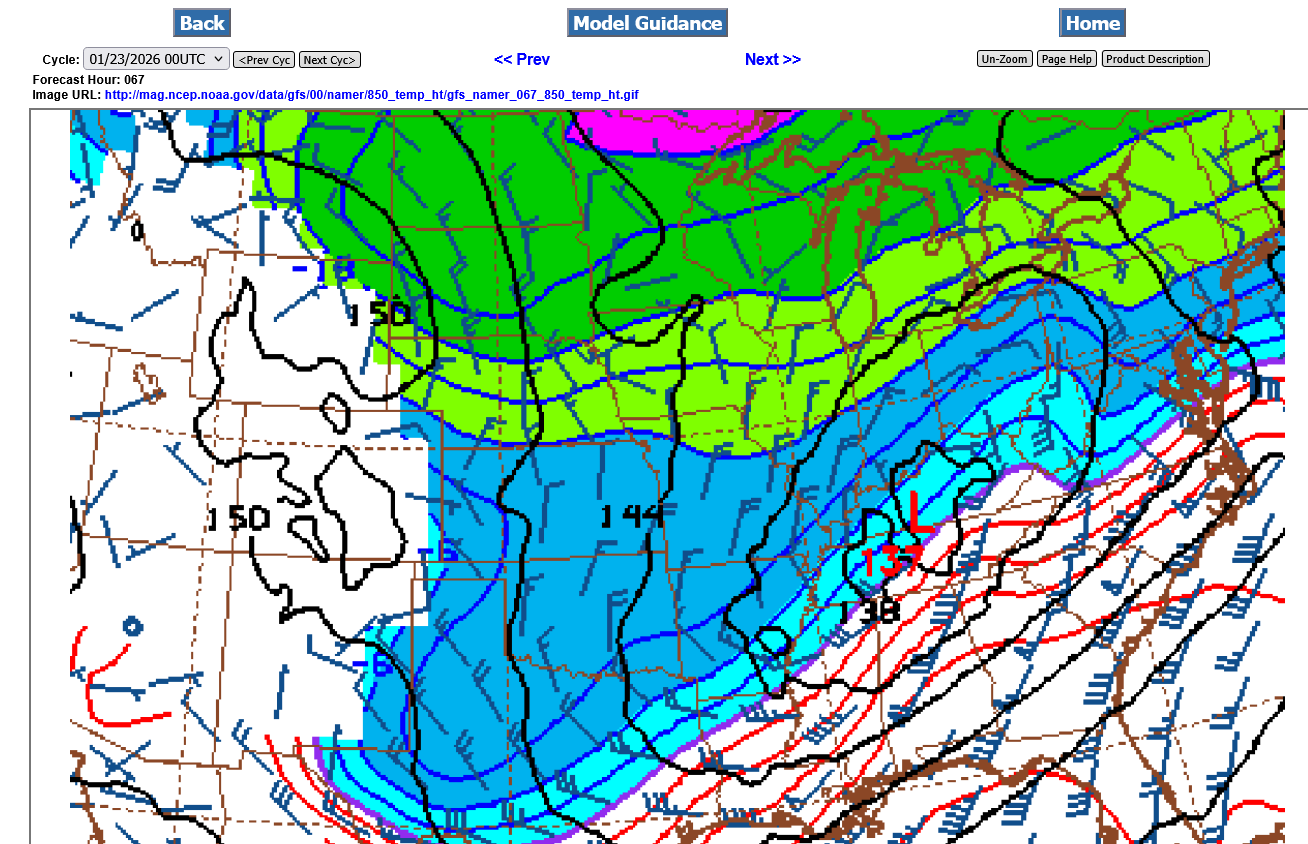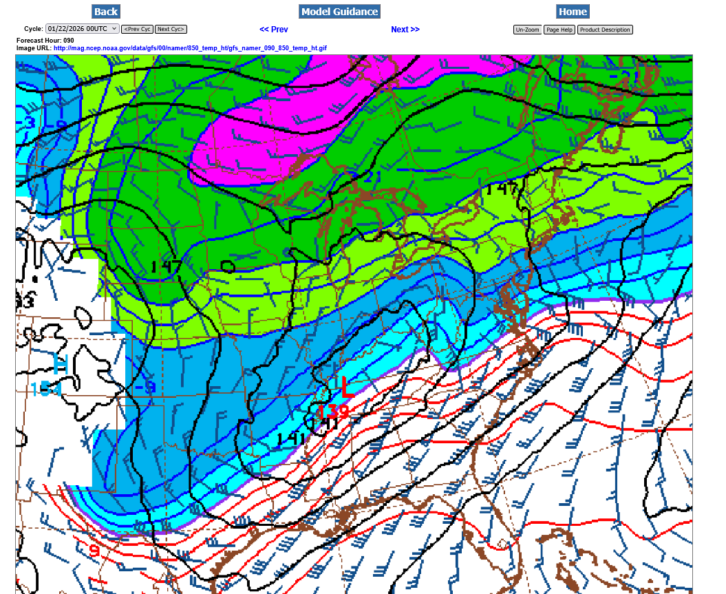 There will not be any surface development with Arctic High Pressure in charge. However, there will be a low pressure system developing around 1 mile up at 850 mb. This is Sunday midday below at 850 mb. Isotherms(temperature bands) are spaced 5 Deg. C apart. The bottom of the light blue is 0 Deg. C which is the freezing point. This will stay well south of us for the entire event.