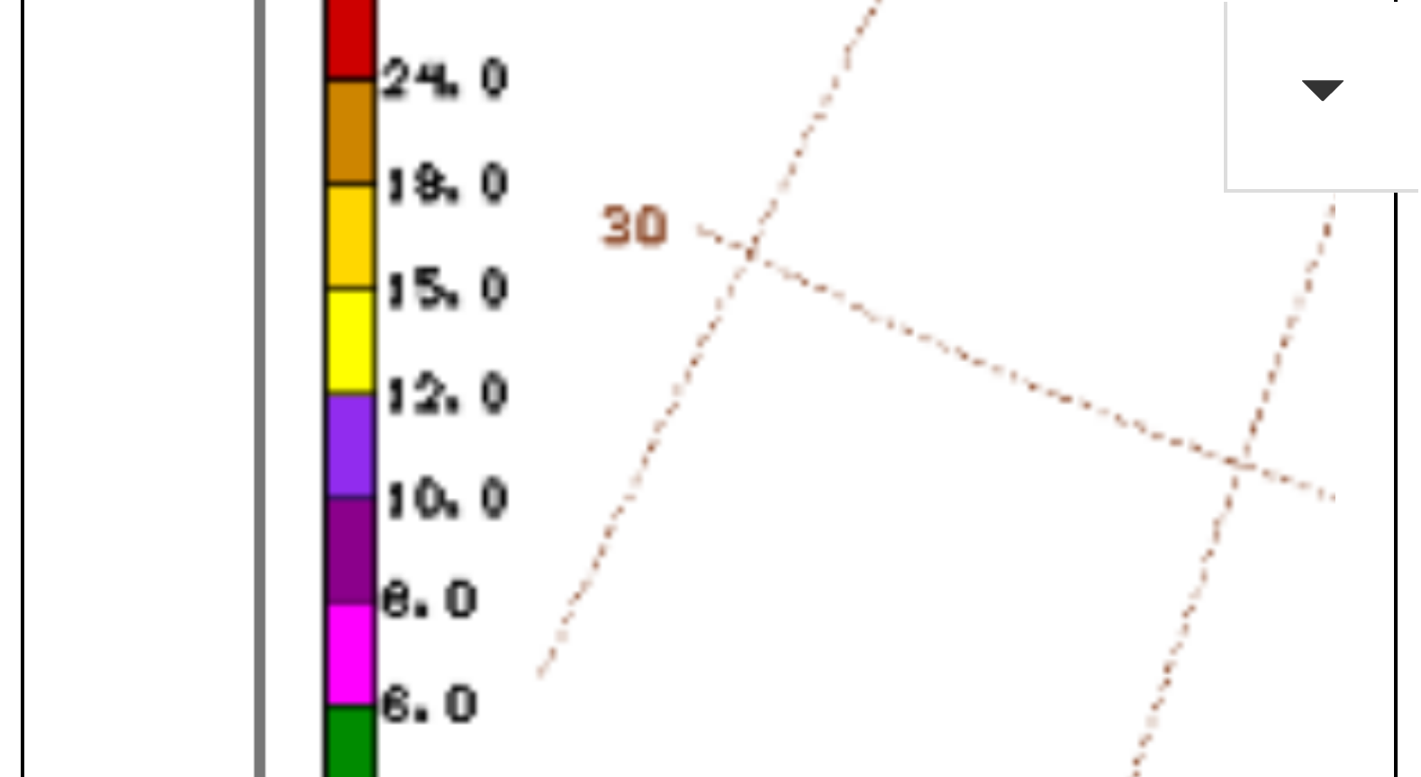 Red = 24 inches. Parts of Arkansas and Virginia.