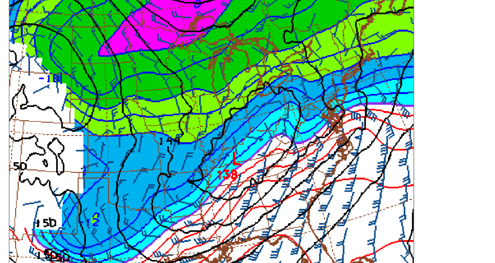 Totally different picture at 1 mile up where all the action will be happening(with dense very cold air hugging the ground. 850 mb low along the Western KY/TN border just north of Nashville. Note the strong south winds ahead of the system at this level pumping in Gulf moisture(which is being suppressed by Arctic HIGH pressure at the surface, above.