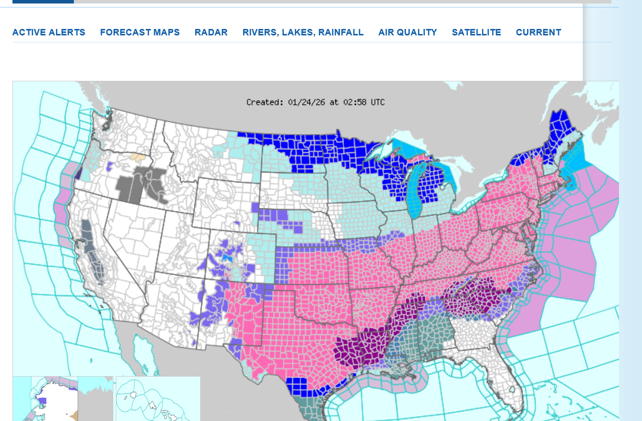 This is a freeze frame image to save. Only 4 states out of 48 contiguous states don't have extreme Winter weather warnings.