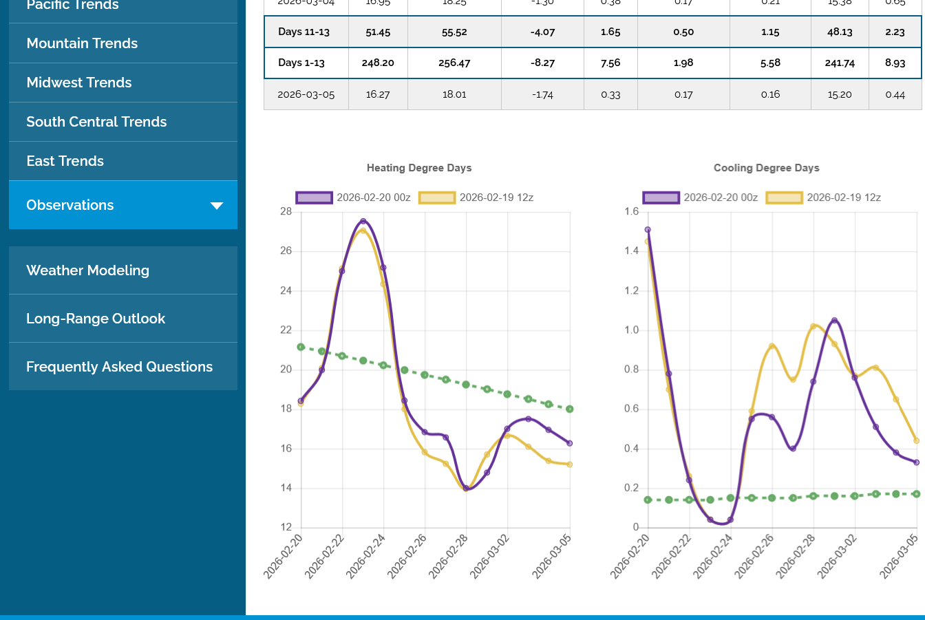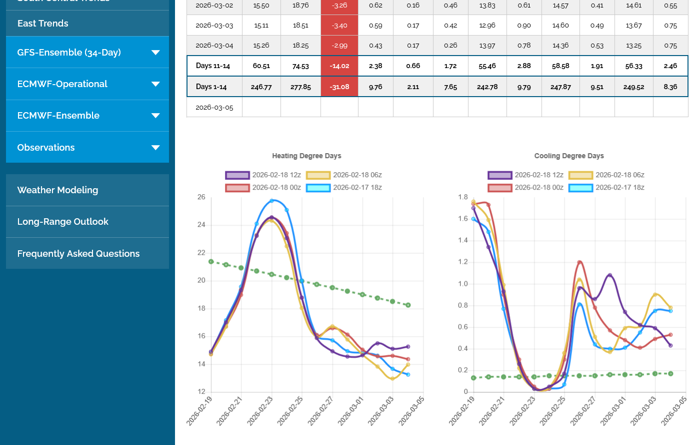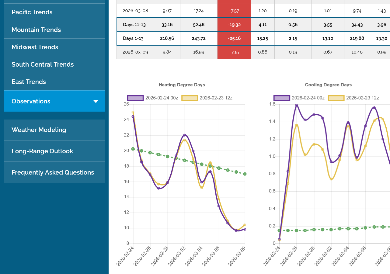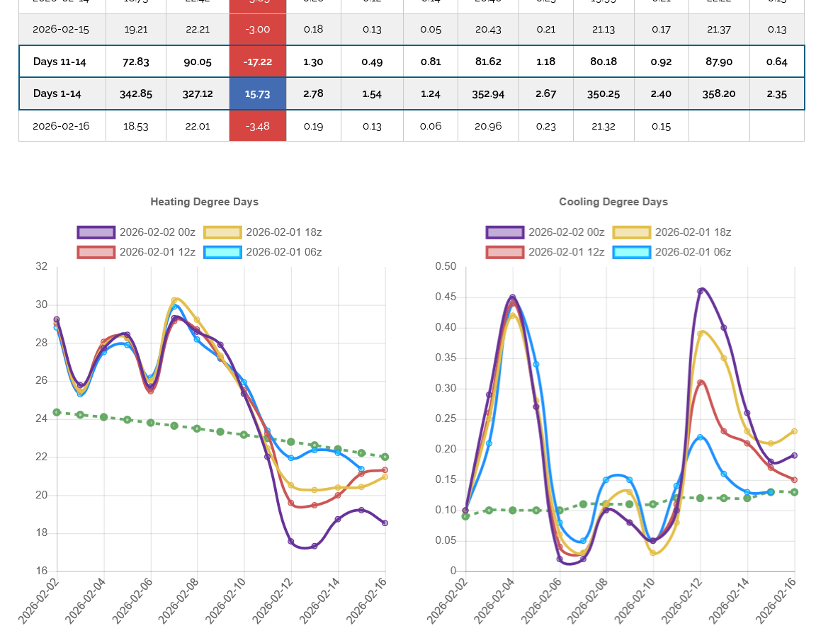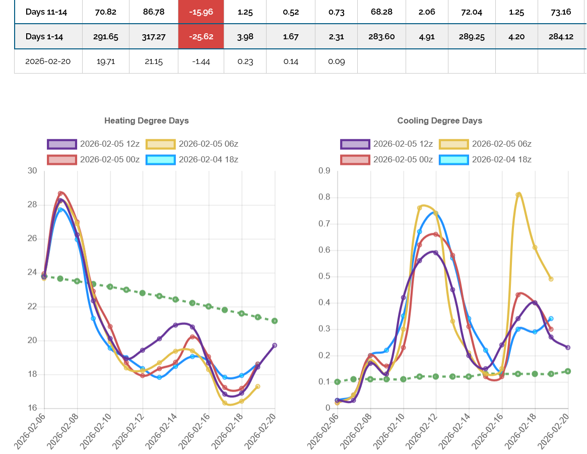 The 12z European Ensemble model (purple/left) had -6 HDDs compared to the previous 0z run,