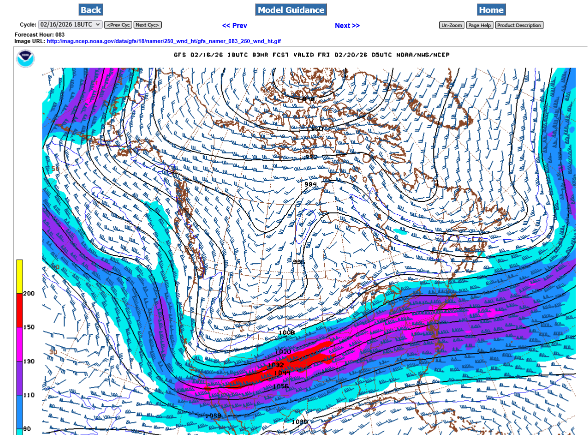 Shifting the map much farther east and time frame to late Thursday, we see the MAINg jet stream aimed in this direction. The red shade is 150 knots which is almost 175 mph.