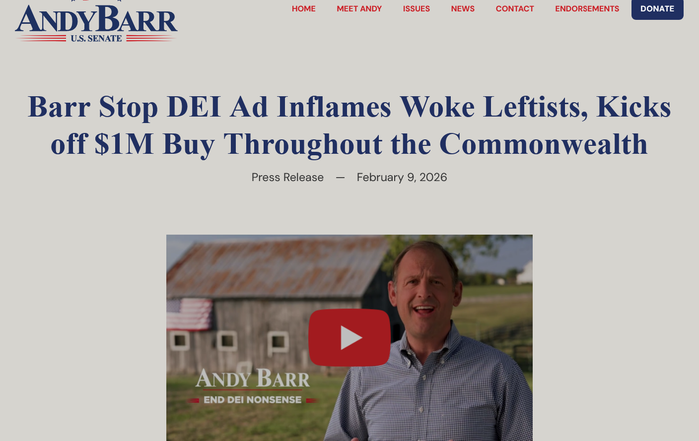 In a 30-second adreleased over the weekend, U.S. Rep. Andy Barr — running for Sen. Mitch McConnell’s Senate seat — is pictured on a farm. The sun is shining. There is a barn and an American flag behind him. “You know what DEI really stands for?” he says, smiling. “Dumb, evil, indoctrination.”