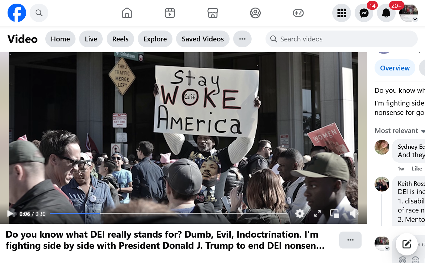 The scene shifts and we see a black man in a crowd. He is wearing a Rev. Martin Luther King Jr. t-shirt and holding up a sign that reads “Stay woke America.”